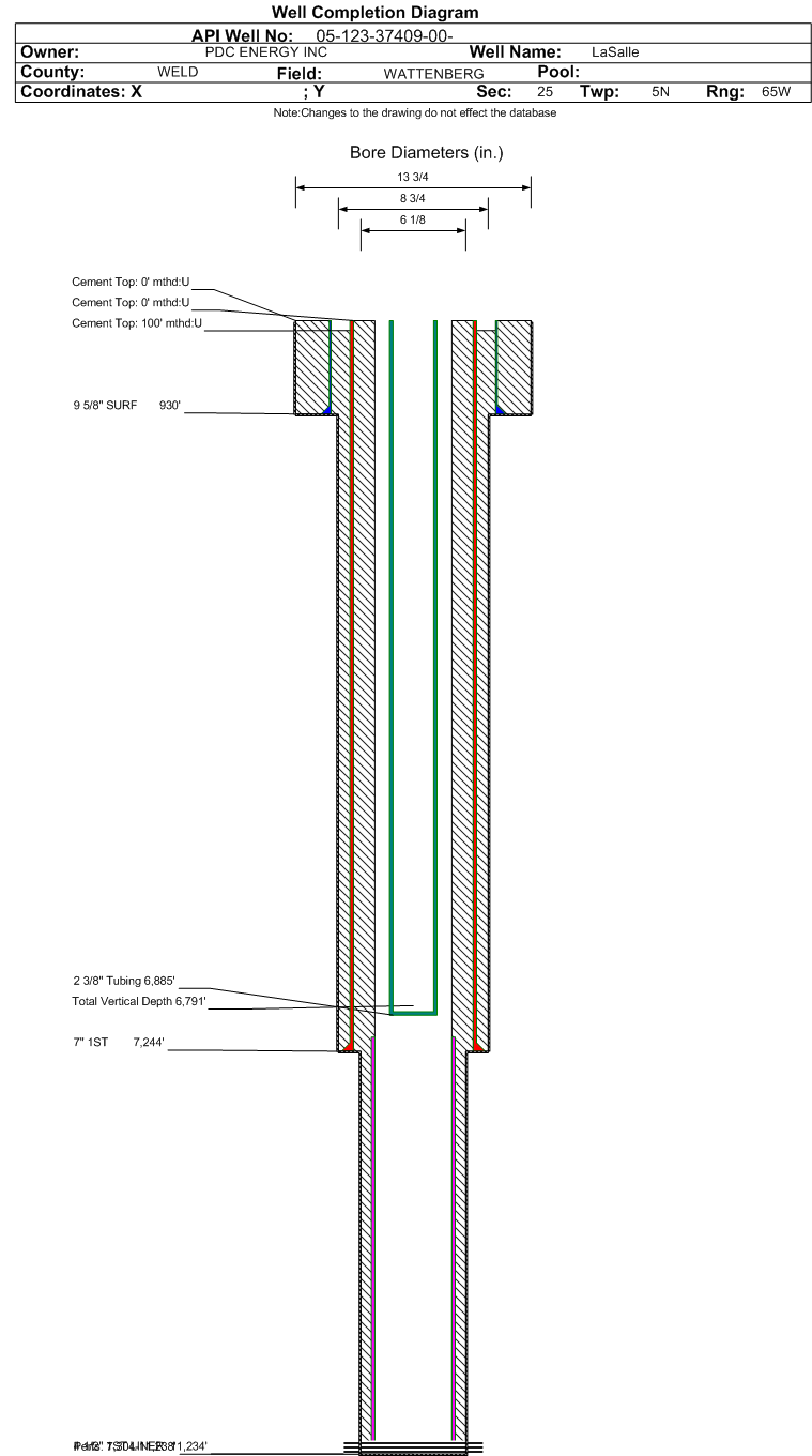 Wellbore #00 Wellbore Classification: OW Status: SI - 7/1/2025 Measured TD: 11238 ft. Vertical TD: 6791 ft.| Wellbore Data for Original Wellbore | Wellbore Classification: OW SI - 7/1/2025 | | Wellbore Permit | HORIZONTAL | | Permit #: | | Expiration Date: | 5/21/2015 | | Proposed Top PZ Location: | Sec:25 Twp: 5N 65W | Footage: 2038 FNL 863 FWL | | Bottom Hole Location: | Sec:25 Twp: 5N 65W | Footage: 2031 FNL 501 FEL | | Proposed Depth/Form: | 11254 ft. | | Surface Mineral Owner Same: | No | | Mineral Owner: | FEE | Surface Owner: | FEE | | Unit: | | Unit Number: | | | Formation And Spacing: | Code: NBRR , Formation: NIOBRARA , Order: , Unit Acreage: 160, Drill Unit: GWA | | Casing: | String Type: SURF, Hole Size: 12.25 in., Size: 9.625 in., Top: 0 ft., Depth: 875 ft., Weight: 36 , Citings Type: PLANNED | | Cement: | Sacks: 830, Top: 0 ft., Bottom: 875 ft. | | Casing: | String Type: 1ST, Hole Size: 8.75 in., Size: 7 in., Top: 0 ft., Depth: 7270 ft., Weight: 26 , Citings Type: PLANNED | | Cement: | Sacks: 650, Top: 500 ft., Bottom: 7270 ft. | | Casing: | String Type: 1ST LINER, Hole Size: 6.125 in., Size: 4.5 in., Top: 6061 ft., Depth: 11254 ft., Weight: 11.6 , Citings Type: PLANNED | | Cement: | Sacks: , Top: , Bottom: |