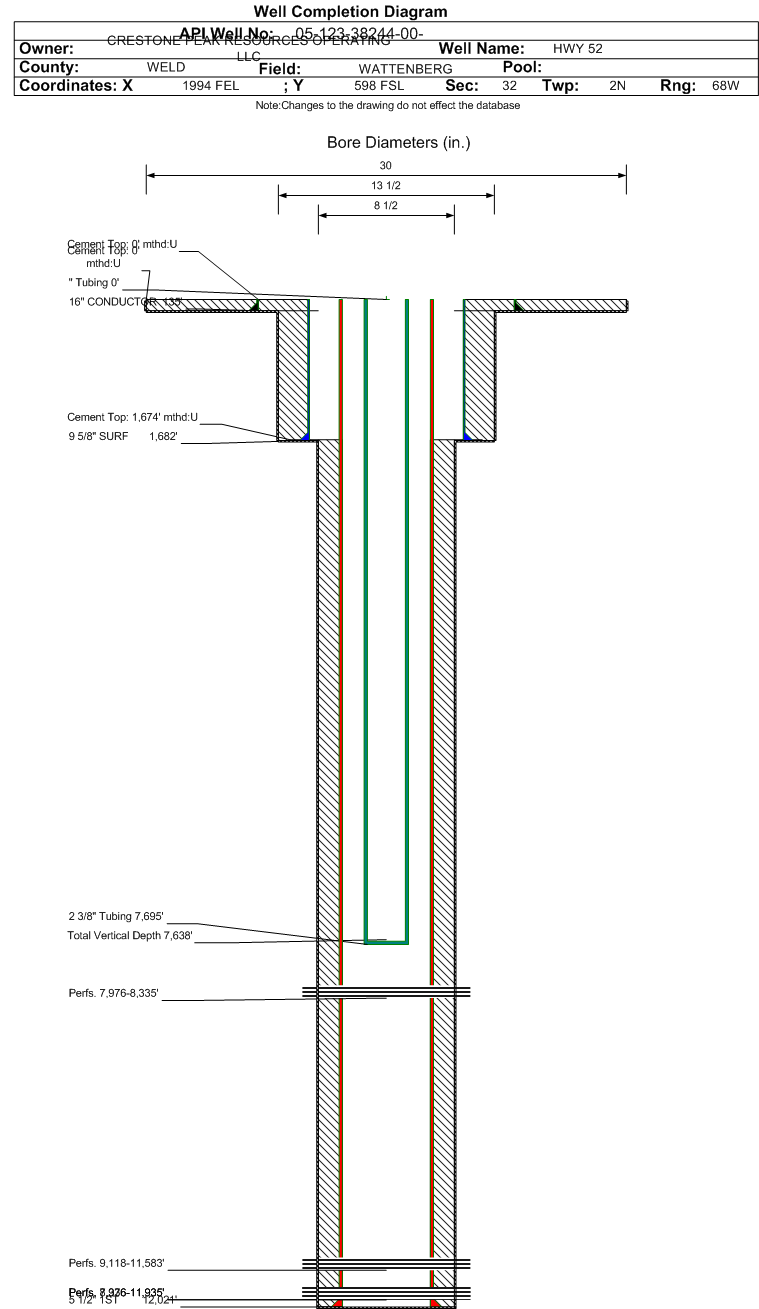| Wellbore Completed | | Completion Date: | 7/12/2017 | | Spud Date: | 3/18/2017 | Spud Date Is: | ACTUAL | | Measured TD: | 12060 ft. | Measured PB depth: | 11992 ft. | | True Vertical TD: | 7638 ft. | True Vertical PB depth: | 7638 ft. | | Top PZ Location: | Sec:32 Twp: 2N 68W | Footage: 780 FSL 2499 FEL | | Bottom Hole Location: | Sec:32 Twp: 2N 68W | Footage: 465 FNL 2508 FEL | | Log Types: | Mud, MWD/LWD, CBL, (Resistivity in 123-38246) | | Casing: | String Type: CONDUCTOR, Hole Size: 30 in., Size: 16 in., Top: 0 ft., Depth: 135 ft., Weight: 65 , Citings Type: ACTUAL | | Cement: | Sacks: 190, Top: 0 ft., Bottom: 135 ft., Determination Method: VISU | | Casing: | String Type: SURF, Hole Size: 13.5 in., Size: 9.625 in., Top: 0 ft., Depth: 1682 ft., Weight: 40 , Citings Type: ACTUAL | | Cement: | Sacks: 635, Top: 0 ft., Bottom: 1682 ft., Determination Method: VISU | | Casing: | String Type: 1ST, Hole Size: 8.5 in., Size: 5.5 in., Top: 0 ft., Depth: 12021 ft., Weight: 20 , Citings Type: ACTUAL | | Cement: | Sacks: 1435, Top: 1674 ft., Bottom: 12021 ft., Determination Method: CBL | | Formation | Interval Top | Log Bottom | Cored | DSTs | | SUSSEX | 4357 ft. | | | | | SHANNON | 5009 ft. | | | | | TEEPEE BUTTES | 6542 ft. | | | | | SHARON SPRINGS | 7364 ft. | | | | | NIOBRARA | 7488 ft. | | | | | FORT HAYS | 8336 ft. | | | | | CODELL | 9118 ft. | | | |