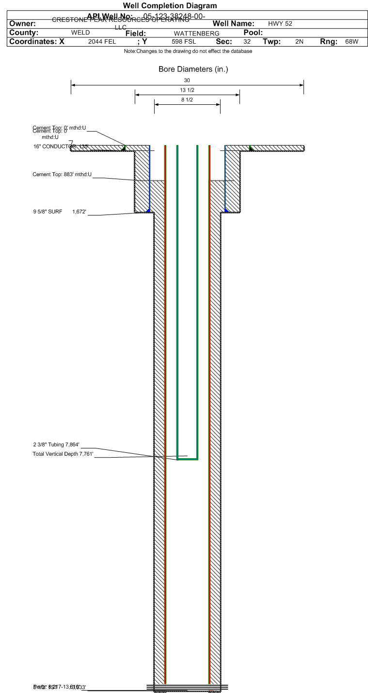 | Wellbore Completed | | Completion Date: | 6/11/2017 | | Spud Date: | 3/23/2017 | Spud Date Is: | ACTUAL | | Measured TD: | 13680 ft. | Measured PB depth: | 13623 ft. | | True Vertical TD: | 7761 ft. | True Vertical PB depth: | 7762 ft. | | Top PZ Location: | Sec:32 Twp: 2N 68W | Footage: 580 FSL 940 FEL | | Bottom Hole Location: | Sec:5 Twp: 1N 68W | Footage: 468 FSL 919 FEL | | Log Types: | Mud Log, MWD/LWD ,CBL. (Resistivity in 123-38246) | | Casing: | String Type: CONDUCTOR, Hole Size: 30 in., Size: 16 in., Top: 0 ft., Depth: 135 ft., Weight: 65 , Citings Type: ACTUAL | | Cement: | Sacks: 190, Top: 0 ft., Bottom: 135 ft., Determination Method: VISU | | Casing: | String Type: SURF, Hole Size: 13.5 in., Size: 9.625 in., Top: 0 ft., Depth: 1672 ft., Weight: 40 , Citings Type: ACTUAL | | Cement: | Sacks: 636, Top: 0 ft., Bottom: 1672 ft., Determination Method: VISU | | Casing: | String Type: 1ST, Hole Size: 8.5 in., Size: 5.5 in., Top: 0 ft., Depth: 13633 ft., Weight: 20 , Citings Type: ACTUAL | | Cement: | Sacks: 1809, Top: 883 ft., Bottom: 13680 ft., Determination Method: CBL | | Formation | Interval Top | Log Bottom | Cored | DSTs | | SUSSEX | 4397 ft. | | | | | SHANNON | 5040 ft. | | | | | TEEPEE BUTTES | 6584 ft. | | | | | SHARON SPRINGS | 7400 ft. | | | | | NIOBRARA | 7503 ft. | | | | | FORT HAYS | 8029 ft. | | | | | CODELL | 8142 ft. | | | |