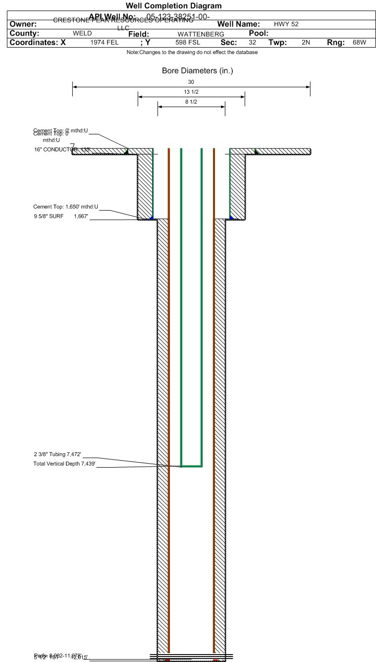 Wellbore #00 Wellbore Classification: OW Status: PR - 8/13/2018 Measured TD: 12035 ft. Vertical TD: 7439 ft.| Wellbore Data for Original Wellbore | Wellbore Classification: OW PR - 8/13/2018 | | Wellbore Permit | HORIZONTAL | | Permit #: | | Expiration Date: | 4/21/2018 | | Proposed Top PZ Location: | Sec:32 Twp: 2N 68W | Footage: 779 FSL 2089 FEL | | Bottom Hole Location: | Sec:32 Twp: 2N 68W | Footage: 514 FNL 2139 FEL | | Proposed Depth/Form: | 12021 ft. | | Surface Mineral Owner Same: | No | | Mineral Owner: | FEE | Surface Owner: | FEE | | Unit: | | Unit Number: | | | Formation And Spacing: | Code: NBRR , Formation: NIOBRARA , Order: , Unit Acreage: 160, Drill Unit: GWA | | Casing: | String Type: CONDUCTOR, Hole Size: 22 in., Size: 16 in., Top: 0 ft., Depth: 80 ft., Weight: 30 , Citings Type: PLANNED | | Cement: | Sacks: 80, Top: 0 ft., Bottom: 80 ft. | | Casing: | String Type: SURF, Hole Size: 13.5 in., Size: 9.625 in., Top: 0 ft., Depth: 1684 ft., Weight: 40 , Citings Type: PLANNED | | Cement: | Sacks: 735, Top: 0 ft., Bottom: 1684 ft. | | Casing: | String Type: 1ST, Hole Size: 8.75 in., Size: 5.5 in., Top: 0 ft., Depth: 11960 ft., Weight: 20 , Citings Type: PLANNED | | Cement: | Sacks: 1938, Top: , Bottom: 11960 ft. |