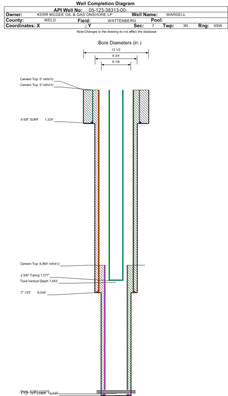 | Wellbore Completed | | Completion Date: | 11/23/2014 | | Spud Date: | 9/15/2014 | Spud Date Is: | ACTUAL | | Measured TD: | 12143 ft. | Measured PB depth: | 12089 ft. | | True Vertical TD: | 7643 ft. | True Vertical PB depth: | 7642 ft. | | Top PZ Location: | Sec:7 Twp: 3N 65W | Footage: 694 FSL 967 FWL | | Bottom Hole Location: | Sec:7 Twp: 3N 65W | Footage: 487 FNL 1012 FWL | | Log Types: | CBL, LWD with GR, MUD, (IND in API# 05-123-20964*) | | Casing: | String Type: SURF, Hole Size: 13.5 in., Size: 9.625 in., Top: 0 ft., Depth: 1324 ft., Weight: 36 , Citings Type: ACTUAL | | Cement: | Sacks: 505, Top: 0 ft., Bottom: 1324 ft., Determination Method: VISU | | Casing: | String Type: 1ST, Hole Size: 8.75 in., Size: , Top: 0 ft., Depth: 8046 ft., Weight: 26 , Citings Type: ACTUAL | | Cement: | Sacks: 730, Top: 0 ft., Bottom: 8046 ft., Determination Method: CBL | | Casing: | String Type: 1ST LINER, Hole Size: 6.125 in., Size: 4.5 in., Top: 6964 ft., Depth: 12137 ft., Weight: 11.6 , Citings Type: ACTUAL | | Cement: | Sacks: 280, Top: 6964 ft., Bottom: 12137 ft., Determination Method: CALC | | Formation | Interval Top | Log Bottom | Cored | DSTs | | SUSSEX | 4656 ft. | | | | | SHARON SPRINGS | 7140 ft. | | | | | NIOBRARA | 7192 ft. | | | | | FORT HAYS | 7486 ft. | | | | | CODELL | 7515 ft. | | | | | CARLILE | 7540 ft. | | | | | GREENHORN | 7615 ft. | | | |