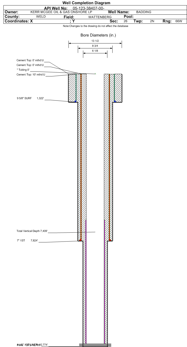 Wellbore #00 Wellbore Classification: OW Status: PR - 11/1/2023 Measured TD: 12789 ft. Vertical TD: 7409 ft.| Wellbore Data for Original Wellbore | Wellbore Classification: OW PR - 11/1/2023 | | Wellbore Permit | HORIZONTAL | | Permit #: | | Expiration Date: | 11/9/2015 | | Proposed Top PZ Location: | Sec:26 Twp: 2N 66W | Footage: 475 FSL 1740 FEL | | Bottom Hole Location: | Sec:23 Twp: 2N 66W | Footage: 175 FSL 1747 FEL | | Proposed Depth/Form: | 12697 ft. | | Surface Mineral Owner Same: | No | | Mineral Owner: | FEE | Surface Owner: | FEE | | Unit: | | Unit Number: | | | Formation And Spacing: | Code: NBRR , Formation: NIOBRARA , Order: , Unit Acreage: 400, Drill Unit: GWA | | Casing: | String Type: SURF, Hole Size: 13.5 in., Size: 9.625 in., Top: 0 ft., Depth: 1302 ft., Weight: 36 , Citings Type: PLANNED | | Cement: | Sacks: 490, Top: 0 ft., Bottom: 1302 ft. | | Casing: | String Type: 1ST, Hole Size: 8.75 in., Size: 7 in., Top: 0 ft., Depth: 7690 ft., Weight: 26 , Citings Type: PLANNED | | Cement: | Sacks: 810, Top: 0 ft., Bottom: 7690 ft. | | Casing: | String Type: 1ST LINER, Hole Size: 6.125 in., Size: 4.5 in., Top: 6693 ft., Depth: 12697 ft., Weight: 11.6 , Citings Type: PLANNED | | Cement: | Sacks: , Top: , Bottom: |