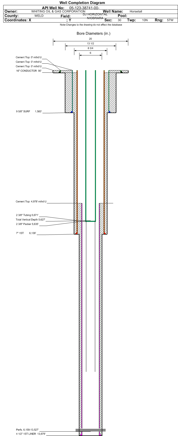 Wellbore #00 Wellbore Classification: OW Status: PR - 4/1/2018 Measured TD: 13684 ft. Vertical TD: 5627 ft.| Wellbore Data for Original Wellbore | Wellbore Classification: OW PR - 4/1/2018 | | Wellbore Permit | HORIZONTAL | | Permit #: | | Expiration Date: | 12/29/2015 | | Proposed Top PZ Location: | Sec:30 Twp: 10N 57W | Footage: 1490 FNL 1875 FWL | | Bottom Hole Location: | Sec:19 Twp: 10N 57W | Footage: 100 FNL 1815 FWL | | Proposed Depth/Form: | 12590 ft. | | Surface Mineral Owner Same: | No | | Mineral Owner: | FEE | Surface Owner: | FEE | | Unit: | | Unit Number: | | | Formation And Spacing: | Code: NBRR , Formation: NIOBRARA , Order: 535-369 , Unit Acreage: 960, Drill Unit: S.19:All,S.30:N/2 | | Casing: | String Type: CONDUCTOR, Hole Size: 16.063 in., Size: 16 in., Top: 0 ft., Depth: 80 ft., Weight: 65 , Citings Type: PLANNED | | Cement: | Sacks: , Top: , Bottom: | | Casing: | String Type: SURF, Hole Size: 13.5 in., Size: 9.625 in., Top: 0 ft., Depth: 1550 ft., Weight: 36 , Citings Type: PLANNED | | Cement: | Sacks: 689, Top: 0 ft., Bottom: 1550 ft. | | Casing: | String Type: 1ST, Hole Size: 8.75 in., Size: 7 in., Top: 0 ft., Depth: 5897 ft., Weight: 29 , Citings Type: PLANNED | | Cement: | Sacks: 396, Top: 0 ft., Bottom: 5897 ft. | | Casing: | String Type: 1ST LINER, Hole Size: 6 in., Size: 4.5 in., Top: 5115 ft., Depth: 12590 ft., Weight: 11.6 , Citings Type: PLANNED | | Cement: | Sacks: , Top: , Bottom: |