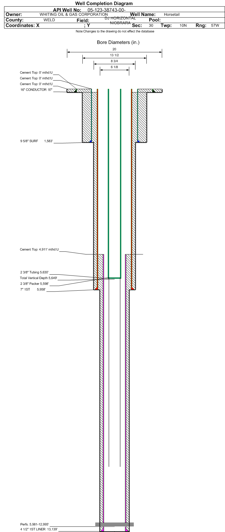 Wellbore #00 Wellbore Classification: OW Status: PR - 4/1/2018 Measured TD: 13158 ft. Vertical TD: 5649 ft.| Wellbore Data for Original Wellbore | Wellbore Classification: OW PR - 4/1/2018 | | Wellbore Permit | HORIZONTAL | | Permit #: | | Expiration Date: | 12/29/2015 | | Proposed Top PZ Location: | Sec:30 Twp: 10N 57W | Footage: 1540 FNL 2387 FWL | | Bottom Hole Location: | Sec:19 Twp: 10N 57W | Footage: 100 FNL 2475 FWL | | Proposed Depth/Form: | 12671 ft. | | Surface Mineral Owner Same: | No | | Mineral Owner: | FEE | Surface Owner: | FEE | | Unit: | | Unit Number: | | | Formation And Spacing: | Code: NBRR , Formation: NIOBRARA , Order: 535-369 , Unit Acreage: 960, Drill Unit: S.19:ALL,S.30:N/2 | | Casing: | String Type: CONDUCTOR, Hole Size: 16.063 in., Size: 16 in., Top: 0 ft., Depth: 80 ft., Weight: 65 , Citings Type: PLANNED | | Cement: | Sacks: , Top: , Bottom: | | Casing: | String Type: SURF, Hole Size: 13.5 in., Size: 9.625 in., Top: 0 ft., Depth: 1550 ft., Weight: 36 , Citings Type: PLANNED | | Cement: | Sacks: 689, Top: 0 ft., Bottom: 1550 ft. | | Casing: | String Type: 1ST, Hole Size: 8.75 in., Size: 7 in., Top: 0 ft., Depth: 5897 ft., Weight: 29 , Citings Type: PLANNED | | Cement: | Sacks: 396, Top: 0 ft., Bottom: 5897 ft. | | Casing: | String Type: 1ST LINER, Hole Size: 6 in., Size: 4.5 in., Top: 5115 ft., Depth: 12671 ft., Weight: 11.6 , Citings Type: PLANNED | | Cement: | Sacks: , Top: , Bottom: |