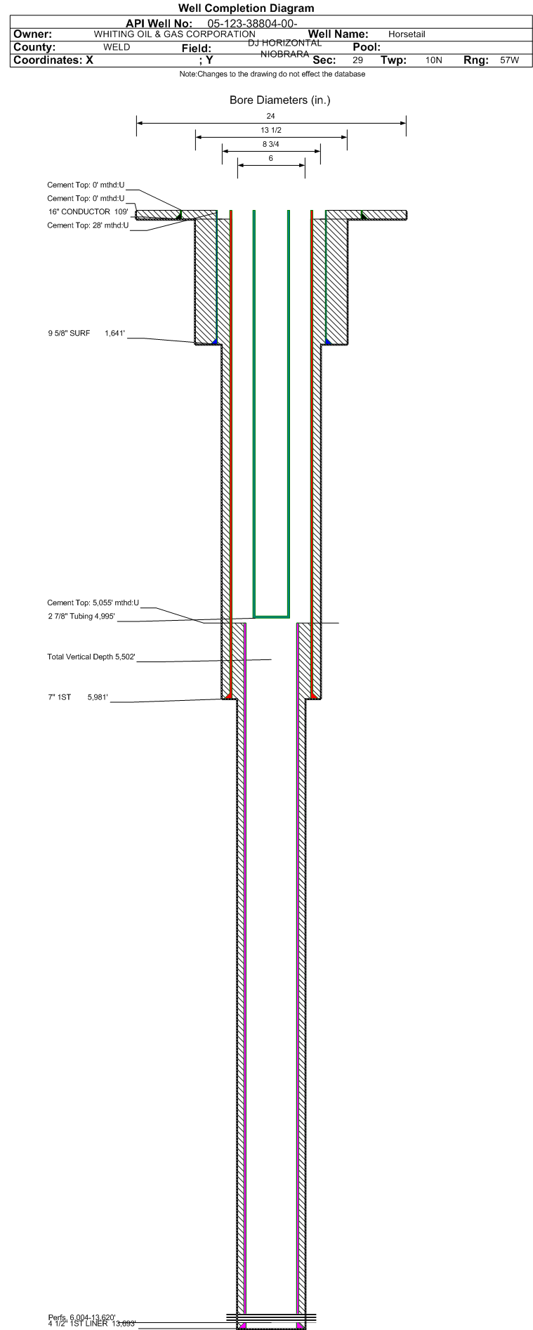 | Wellbore Completed | | Completion Date: | 10/28/2014 | | Spud Date: | 10/19/2014 | Spud Date Is: | ACTUAL | | Measured TD: | 13700 ft. | Measured PB depth: | 13647 ft. | | True Vertical TD: | 5502 ft. | True Vertical PB depth: | 5503 ft. | | Top PZ Location: | Sec:29 Twp: 10N 57W | Footage: 2513 FNL 1561 FEL | | Bottom Hole Location: | Sec:20 Twp: 10N 57W | Footage: 111 FNL 1468 FEL | | Log Types: | LWD, Mud, CBL, TRIPLE COMBO, CALIPER, DENS, IND, SPECTRAL GAMMA, PULSED NEUTRON. | | Casing: | String Type: CONDUCTOR, Hole Size: 24 in., Size: 16 in., Top: 0 ft., Depth: 109 ft., Weight: 42.09 , Citings Type: ACTUAL | | Cement: | Sacks: , Top: 0 ft., Bottom: 109 ft., Determination Method: VISU | | Casing: | String Type: SURF, Hole Size: 13.5 in., Size: 9.625 in., Top: 0 ft., Depth: 1641 ft., Weight: 36 , Citings Type: ACTUAL | | Cement: | Sacks: 700, Top: 0 ft., Bottom: 1641 ft., Determination Method: VISU | | Casing: | String Type: 1ST, Hole Size: 8.75 in., Size: 7 in., Top: 0 ft., Depth: 5981 ft., Weight: 29 , Citings Type: ACTUAL | | Cement: | Sacks: 655, Top: 28 ft., Bottom: 5981 ft., Determination Method: CBL | | Casing: | String Type: 1ST LINER, Hole Size: 6 in., Size: 4.5 in., Top: 5055 ft., Depth: 13693 ft., Weight: 11.60 , Citings Type: ACTUAL | | Cement: | Sacks: 580, Top: 5055 ft., Bottom: 13693 ft., Determination Method: CALC | | Formation | Interval Top | Log Bottom | Cored | DSTs | | PIERRE | 1525 ft. | | N | N | | HYGIENE | 3565 ft. | | N | N | | SHARON SPRINGS | 5397 ft. | | N | N | | NIOBRARA | 5404 ft. | | N | N |