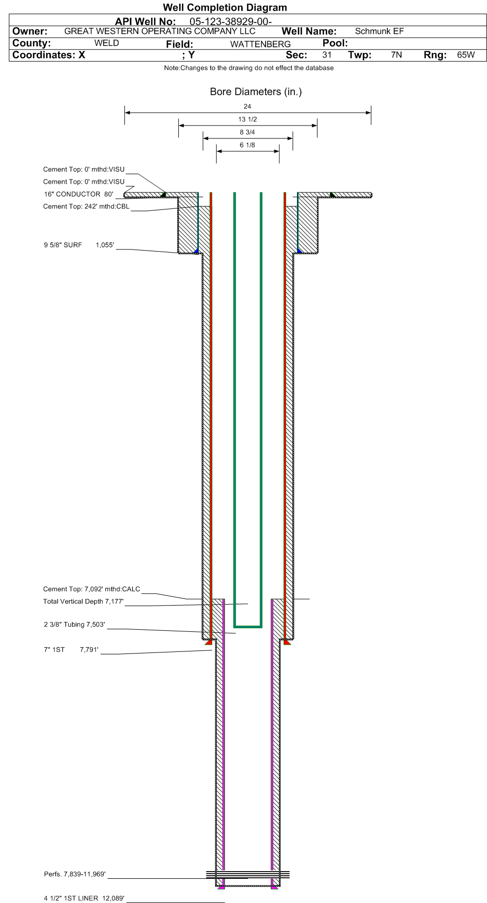 Wellbore #00 Wellbore Classification: OW Status: SI - 10/1/2023 Measured TD: 12094 ft. Vertical TD: 7177 ft.| Wellbore Data for Original Wellbore | Wellbore Classification: OW SI - 10/1/2023 | | Wellbore Permit | HORIZONTAL | | Permit #: | | Expiration Date: | 2/12/2016 | | Proposed Top PZ Location: | Sec:31 Twp: 7N 65W | Footage: 460 FNL 470 FEL | | Bottom Hole Location: | Sec:31 Twp: 7N 65W | Footage: 470 FSL 470 FEL | | Proposed Depth/Form: | 12095 ft. | | Surface Mineral Owner Same: | No | | Mineral Owner: | FEE | Surface Owner: | FEE | | Unit: | | Unit Number: | | | Formation And Spacing: | Code: NBRR , Formation: NIOBRARA , Order: , Unit Acreage: 160, Drill Unit: GWA | | Casing: | String Type: CONDUCTOR, Hole Size: 24 in., Size: 16 in., Top: 0 ft., Depth: 40 ft., Weight: 42 , Citings Type: PLANNED | | Cement: | Sacks: 61, Top: 0 ft., Bottom: 40 ft. | | Casing: | String Type: SURF, Hole Size: 13.5 in., Size: 9.625 in., Top: 0 ft., Depth: 1025 ft., Weight: 36 , Citings Type: PLANNED | | Cement: | Sacks: 426, Top: 0 ft., Bottom: 1025 ft. | | Casing: | String Type: 1ST, Hole Size: 8.75 in., Size: 7 in., Top: 0 ft., Depth: 7740 ft., Weight: 23 , Citings Type: PLANNED | | Cement: | Sacks: 707, Top: 725 ft., Bottom: 7740 ft. | | Casing: | String Type: 1ST LINER, Hole Size: 6.125 in., Size: 4.5 in., Top: 6963 ft., Depth: 12096 ft., Weight: 11.6 , Citings Type: PLANNED | | Cement: | Sacks: , Top: , Bottom: |