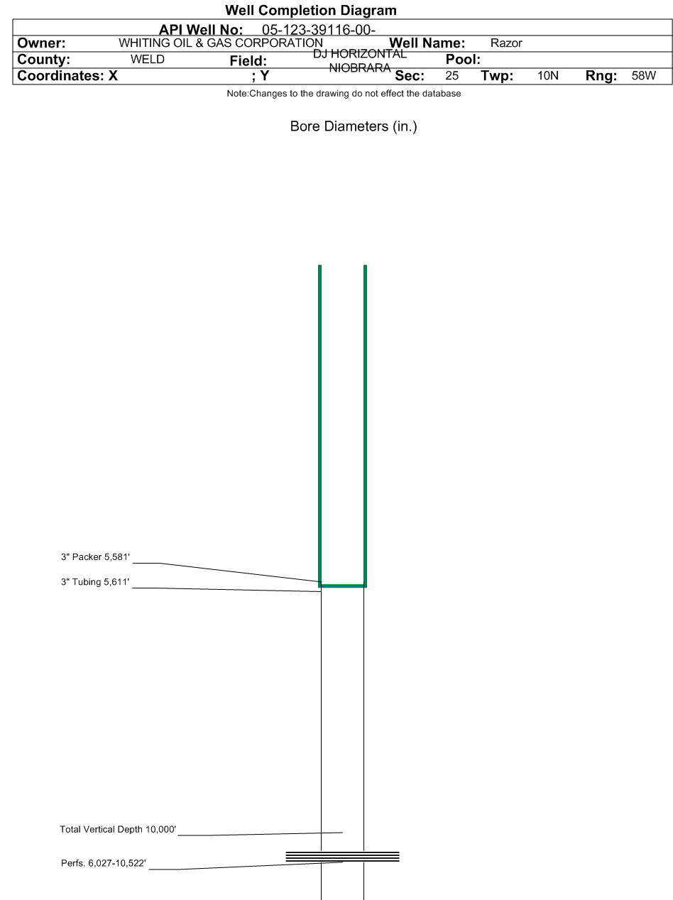 | Wellbore Completed | | Completion Date: | 3/14/2017 | | Spud Date: | 3/10/2017 | Spud Date Is: | ACTUAL | | Measured TD: | 10615 ft. | Measured PB depth: | 10561 ft. | | True Vertical TD: | 5568 ft. | True Vertical PB depth: | 5570 ft. | | Top PZ Location: | Sec:25 Twp: 10N 58W | Footage: 154 FNL 2617 FEL | | Bottom Hole Location: | Sec:25 Twp: 10N 58W | Footage: 563 FSL 2448 FEL | | Log Types: | Mud Log, MWD/LWD, CBL (DEN, IND, GR, Triple Combo in API 123-39119-00) | | Casing: | String Type: CONDUCTOR, Hole Size: 24 in., Size: 16 in., Top: 0 ft., Depth: 101 ft., Weight: 75 , Citings Type: ACTUAL | | Cement: | Sacks: 153, Top: 0 ft., Bottom: 101 ft., Determination Method: VISU | | Casing: | String Type: SURF, Hole Size: 13.5 in., Size: 9.625 in., Top: 0 ft., Depth: 2088 ft., Weight: 36 , Citings Type: ACTUAL | | Cement: | Sacks: 615, Top: 0 ft., Bottom: 2088 ft., Determination Method: VISU | | Casing: | String Type: 1ST, Hole Size: 8.5 in., Size: 5.5 in., Top: 0 ft., Depth: 10603 ft., Weight: 20 , Citings Type: ACTUAL | | Cement: | Sacks: 1790, Top: 24 ft., Bottom: 10615 ft., Determination Method: CBL | | Formation | Interval Top | Log Bottom | Cored | DSTs | | PIERRE | 1448 ft. | | N | N | | HYGIENE | 3270 ft. | | N | N | | SUSSEX | 3815 ft. | | N | N | | SHARON SPRINGS | 5528 ft. | | N | N | | NIOBRARA | 5536 ft. | | N | N |