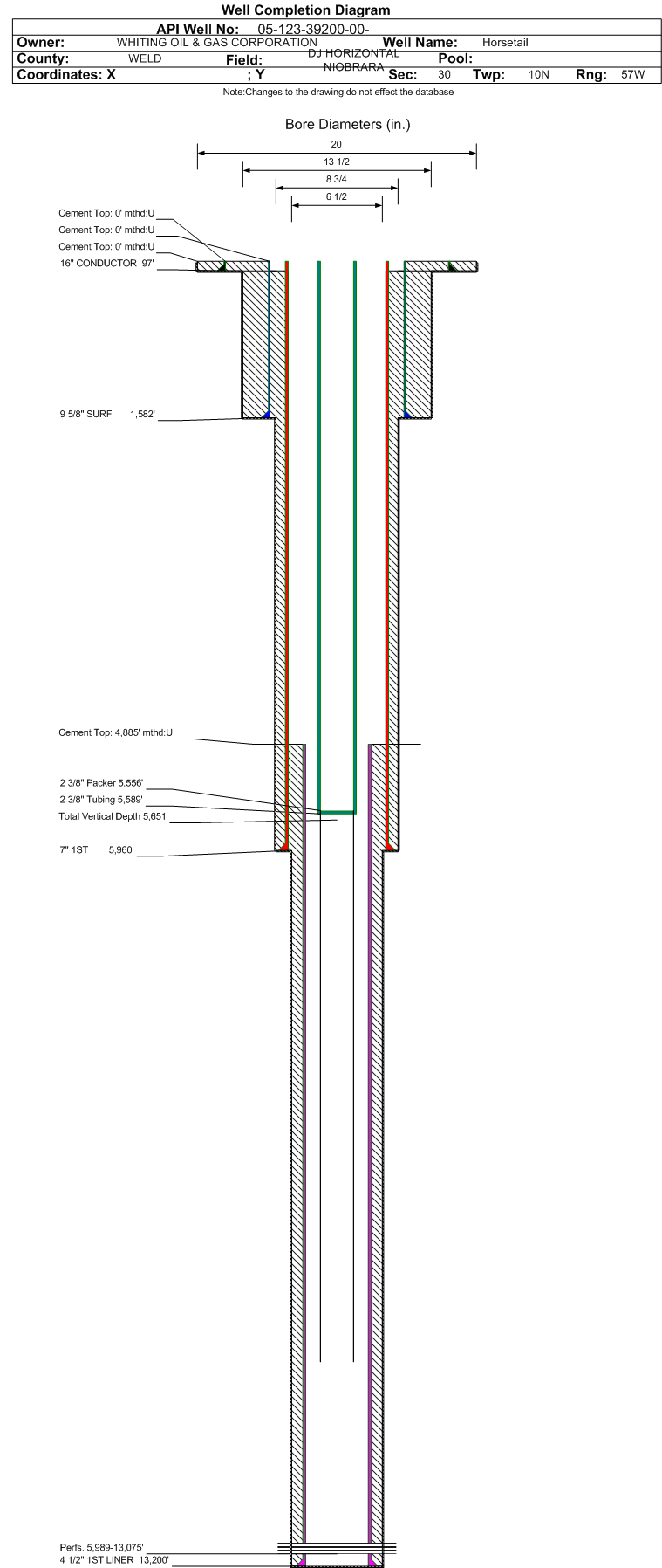 Wellbore #00 Wellbore Classification: OW Status: PR - 4/1/2018 Measured TD: 13210 ft. Vertical TD: 5651 ft.| Wellbore Data for Original Wellbore | Wellbore Classification: OW PR - 4/1/2018 | | Wellbore Permit | HORIZONTAL | | Permit #: | | Expiration Date: | 4/4/2016 | | Proposed Top PZ Location: | Sec:30 Twp: 10N 57W | Footage: 2101 FSL 1957 FWL | | Bottom Hole Location: | Sec:31 Twp: 10N 57W | Footage: 600 FSL 1815 FWL | | Proposed Depth/Form: | 12688 ft. | | Surface Mineral Owner Same: | No | | Mineral Owner: | FEE | Surface Owner: | FEE | | Unit: | | Unit Number: | | | Formation And Spacing: | Code: NBRR , Formation: NIOBRARA , Order: 535-413 , Unit Acreage: 960, Drill Unit: S/2 S30, All S31 | | Casing: | String Type: CONDUCTOR, Hole Size: 16.063 in., Size: 16 in., Top: 0 ft., Depth: 80 ft., Weight: 65 , Citings Type: PLANNED | | Cement: | Sacks: , Top: , Bottom: | | Casing: | String Type: SURF, Hole Size: 13.5 in., Size: 9.625 in., Top: 0 ft., Depth: 1550 ft., Weight: 36 , Citings Type: PLANNED | | Cement: | Sacks: 689, Top: 0 ft., Bottom: 1550 ft. | | Casing: | String Type: 1ST, Hole Size: 8.75 in., Size: 7 in., Top: 0 ft., Depth: 5840 ft., Weight: 29 , Citings Type: PLANNED | | Cement: | Sacks: 392, Top: 0 ft., Bottom: 5840 ft. | | Casing: | String Type: 1ST LINER, Hole Size: 6 in., Size: 4.5 in., Top: 5058 ft., Depth: 12688 ft., Weight: 11.6 , Citings Type: PLANNED | | Cement: | Sacks: 526, Top: 5058 ft., Bottom: 12688 ft. |