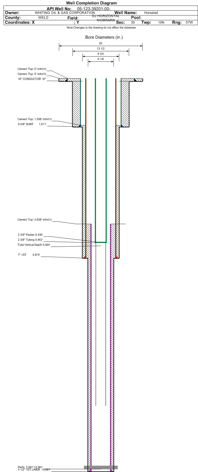 | Wellbore Completed | | Completion Date: | 7/21/2014 | | Spud Date: | 7/12/2014 | Spud Date Is: | ACTUAL | | Measured TD: | 13071 ft. | Measured PB depth: | 13012 ft. | | True Vertical TD: | 5564 ft. | True Vertical PB depth: | 5563 ft. | | Top PZ Location: | Sec:30 Twp: 10N 57W | Footage: 2322 FSL 2372 FWL | | Bottom Hole Location: | Sec:31 Twp: 10N 57W | Footage: 590 FSL 2141 FWL | | Log Types: | LWD, MUD, CBL | | Casing: | String Type: CONDUCTOR, Hole Size: 20 in., Size: 16 in., Top: 0 ft., Depth: 97 ft., Weight: 84 , Citings Type: ACTUAL | | Cement: | Sacks: , Top: 0 ft., Bottom: 97 ft., Determination Method: VISU | | Casing: | String Type: SURF, Hole Size: 13.5 in., Size: 9.625 in., Top: 0 ft., Depth: 1611 ft., Weight: 36 , Citings Type: ACTUAL | | Cement: | Sacks: 456, Top: 0 ft., Bottom: 1611 ft., Determination Method: VISU | | Casing: | String Type: 1ST, Hole Size: 8.75 in., Size: 7 in., Top: 0 ft., Depth: 5974 ft., Weight: 29 , Citings Type: ACTUAL | | Cement: | Sacks: 794, Top: 1558 ft., Bottom: 5974 ft., Determination Method: CBL | | Casing: | String Type: 1ST LINER, Hole Size: 6.125 in., Size: 4.5 in., Top: 4838 ft., Depth: 13061 ft., Weight: 11.60 , Citings Type: ACTUAL | | Cement: | Sacks: 504, Top: 4838 ft., Bottom: 13061 ft., Determination Method: CALC | | Formation | Interval Top | Log Bottom | Cored | DSTs | | PIERRE | 1463 ft. | | N | N | | HYGIENE | 3178 ft. | | N | N | | SHARON SPRINGS | 5797 ft. | | N | N | | NIOBRARA | 5804 ft. | | N | N |