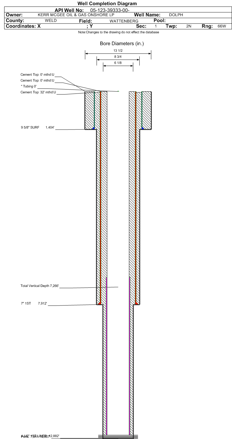 | Wellbore Completed | | Completion Date: | 8/1/2014 | | Spud Date: | 7/6/2014 | Spud Date Is: | ACTUAL | | Measured TD: | 12907 ft. | Measured PB depth: | 12888 ft. | | True Vertical TD: | 7266 ft. | True Vertical PB depth: | 7266 ft. | | Top PZ Location: | Sec:12 Twp: 2N 66W | Footage: 185 FNL 333 FEL | | Bottom Hole Location: | Sec:1 Twp: 2N 66W | Footage: 485 FNL 348 FEL | | Log Types: | CBL, GR, MUD, (DIL in API# 05-123-22887) | | Casing: | String Type: SURF, Hole Size: 13.5 in., Size: 9.625 in., Top: 0 ft., Depth: 1404 ft., Weight: 36 , Citings Type: ACTUAL | | Cement: | Sacks: 563, Top: 0 ft., Bottom: 1404 ft., Determination Method: VISU | | Casing: | String Type: 1ST, Hole Size: 8.75 in., Size: 7 in., Top: 0 ft., Depth: 7912 ft., Weight: 26 , Citings Type: ACTUAL | | Cement: | Sacks: 780, Top: 32 ft., Bottom: 7912 ft., Determination Method: CBL | | Casing: | String Type: 1ST LINER, Hole Size: 6.125 in., Size: 4.5 in., Top: 6899 ft., Depth: 12882 ft., Weight: 11.6 , Citings Type: ACTUAL | | Cement: | Sacks: , Top: , Bottom: , Determination Method: | | Formation | Interval Top | Log Bottom | Cored | DSTs | | SUSSEX | 4566 ft. | | | | | SHARON SPRINGS | 7324 ft. | | | | | NIOBRARA | 7431 ft. | | | |