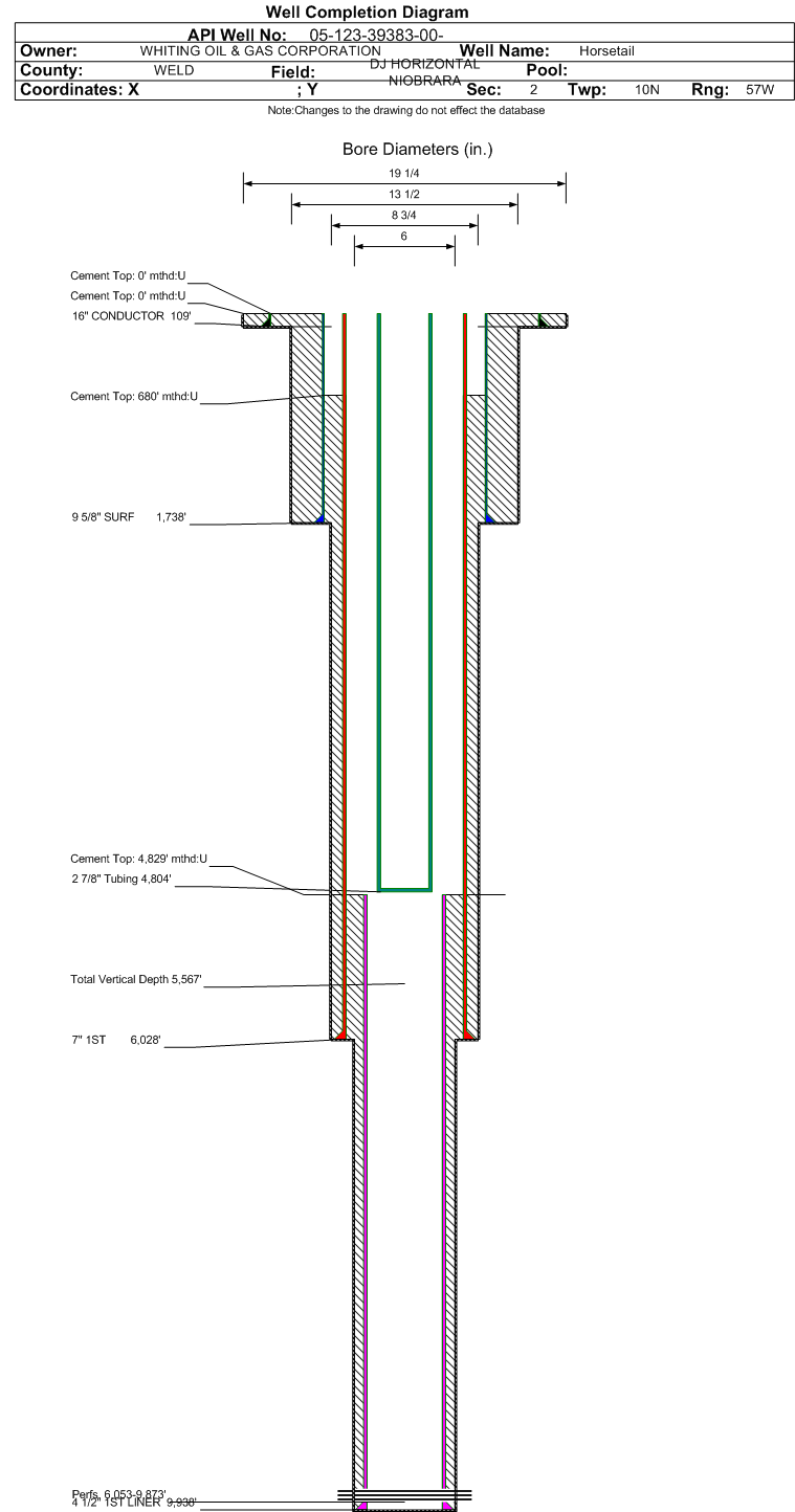 | Wellbore Completed | | Completion Date: | 10/15/2014 | | Spud Date: | 10/7/2014 | Spud Date Is: | ACTUAL | | Measured TD: | 9948 ft. | Measured PB depth: | 9948 ft. | | True Vertical TD: | 5567 ft. | True Vertical PB depth: | 5567 ft. | | Top PZ Location: | Sec:2 Twp: 10N 57W | Footage: 768 FNL 1149 FWL | | Bottom Hole Location: | Sec:2 Twp: 10N 57W | Footage: 626 FSL 1149 FWL | | Log Types: | LWD, MUD, CBL, Neutron logs, Caliper, Density, Induction, Triple Combo, Spectral Gamma. | | Casing: | String Type: CONDUCTOR, Hole Size: 19.25 in., Size: 16 in., Top: 0 ft., Depth: 109 ft., Weight: 42.09 , Citings Type: ACTUAL | | Cement: | Sacks: , Top: 0 ft., Bottom: 109 ft., Determination Method: VISU | | Casing: | String Type: SURF, Hole Size: 13.5 in., Size: 9.625 in., Top: 0 ft., Depth: 1738 ft., Weight: 36.00 , Citings Type: ACTUAL | | Cement: | Sacks: 740, Top: 0 ft., Bottom: 1738 ft., Determination Method: VISU | | Casing: | String Type: 1ST, Hole Size: 8.75 in., Size: 7 in., Top: 0 ft., Depth: 6028 ft., Weight: 29.00 , Citings Type: ACTUAL | | Cement: | Sacks: 655, Top: 680 ft., Bottom: 6028 ft., Determination Method: CBL | | Casing: | String Type: 1ST LINER, Hole Size: 6 in., Size: 4.5 in., Top: 4829 ft., Depth: 9938 ft., Weight: 11.60 , Citings Type: ACTUAL | | Cement: | Sacks: 375, Top: 4829 ft., Bottom: 9938 ft., Determination Method: CALC | | Formation | Interval Top | Log Bottom | Cored | DSTs | | PIERRE | 1520 ft. | | N | N | | HYGIENE | 3330 ft. | | N | N | | SHARON SPRINGS | 5413 ft. | | N | N | | NIOBRARA | 5421 ft. | | N | N |