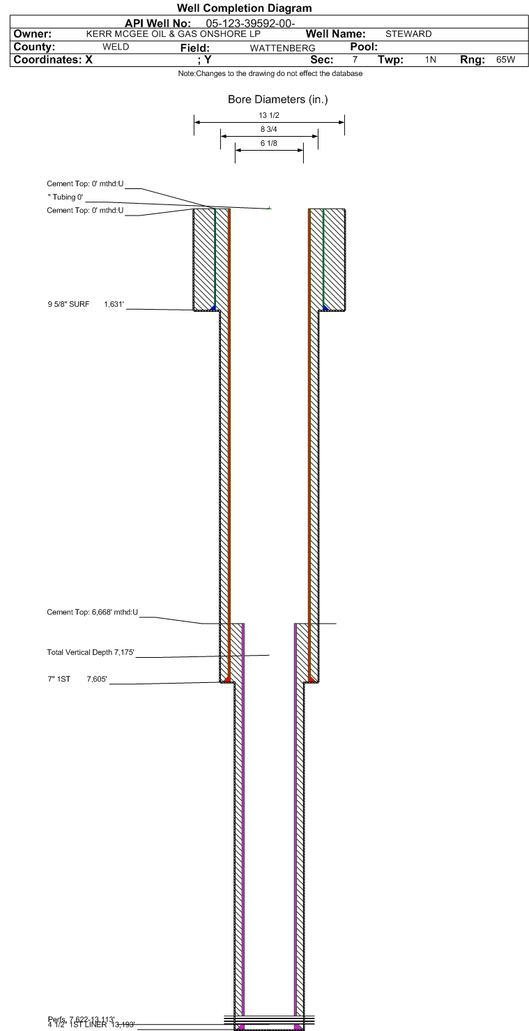 Wellbore #00 Wellbore Classification: OW Status: PR - 7/1/2019 Measured TD: 13197 ft. Vertical TD: 7175 ft.| Wellbore Data for Original Wellbore | Wellbore Classification: OW PR - 7/1/2019 | | Wellbore Permit | HORIZONTAL | | Permit #: | | Expiration Date: | 6/7/2016 | | Proposed Top PZ Location: | Sec:7 Twp: 1N 65W | Footage: 100 FSL 1977 FWL | | Bottom Hole Location: | Sec:6 Twp: 1N 65W | Footage: 410 FSL 2027 FWL | | Proposed Depth/Form: | 12815 ft. | | Surface Mineral Owner Same: | No | | Mineral Owner: | FEE | Surface Owner: | FEE | | Unit: | | Unit Number: | | | Formation And Spacing: | Code: NBRR , Formation: NIOBRARA , Order: , Unit Acreage: 240, Drill Unit: GWA | | Casing: | String Type: SURF, Hole Size: 13.5 in., Size: 9.625 in., Top: 0 ft., Depth: 1540 ft., Weight: 36 , Citings Type: PLANNED | | Cement: | Sacks: 580, Top: 0 ft., Bottom: 1540 ft. | | Casing: | String Type: 1ST, Hole Size: 8.75 in., Size: 7 in., Top: 0 ft., Depth: 7623 ft., Weight: 26 , Citings Type: PLANNED | | Cement: | Sacks: 640, Top: 0 ft., Bottom: 7623 ft. | | Casing: | String Type: 1ST LINER, Hole Size: 6.125 in., Size: 4.5 in., Top: 6623 ft., Depth: 13247 ft., Weight: 11.6 , Citings Type: PLANNED | | Cement: | Sacks: , Top: , Bottom: |
