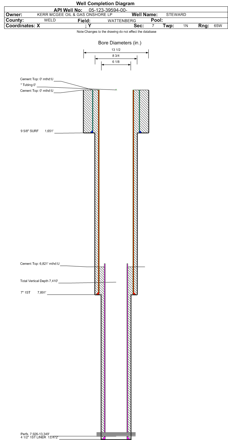 | Wellbore Completed | | Completion Date: | 12/23/2014 | | Spud Date: | 9/26/2014 | Spud Date Is: | ACTUAL | | Measured TD: | 13476 ft. | Measured PB depth: | 13424 ft. | | True Vertical TD: | 7410 ft. | True Vertical PB depth: | 7409 ft. | | Top PZ Location: | Sec:7 Twp: 1N 65W | Footage: 140 FSL 912 FWL | | Bottom Hole Location: | Sec:6 Twp: 1N 65W | Footage: 409 FSL 957 FWL | | Log Types: | CBL, LWD, Mud, (RESISTIVITY in 123-39593) | | Casing: | String Type: SURF, Hole Size: 13.5 in., Size: 9.625 in., Top: 0 ft., Depth: 1651 ft., Weight: 36 , Citings Type: ACTUAL | | Cement: | Sacks: 712, Top: 0 ft., Bottom: 1651 ft., Determination Method: VISU | | Casing: | String Type: 1ST, Hole Size: 8.75 in., Size: 7 in., Top: 0 ft., Depth: 7891 ft., Weight: 26 , Citings Type: ACTUAL | | Cement: | Sacks: 706, Top: 0 ft., Bottom: 7891 ft., Determination Method: CBL | | Casing: | String Type: 1ST LINER, Hole Size: 6.125 in., Size: 4.5 in., Top: 6695 ft., Depth: 13472 ft., Weight: 11.6 , Citings Type: ACTUAL | | Cement: | Sacks: 361, Top: 6821 ft., Bottom: 13472 ft., Determination Method: CALC | | Formation | Interval Top | Log Bottom | Cored | DSTs | | SUSSEX | 4586 ft. | | | | | SHARON SPRINGS | 7163 ft. | | | | | NIOBRARA | 7189 ft. | | | | | FORT HAYS | 7769 ft. | | | | | CODELL | 9167 ft. | | | | | CARLILE | 10356 ft. | | | |