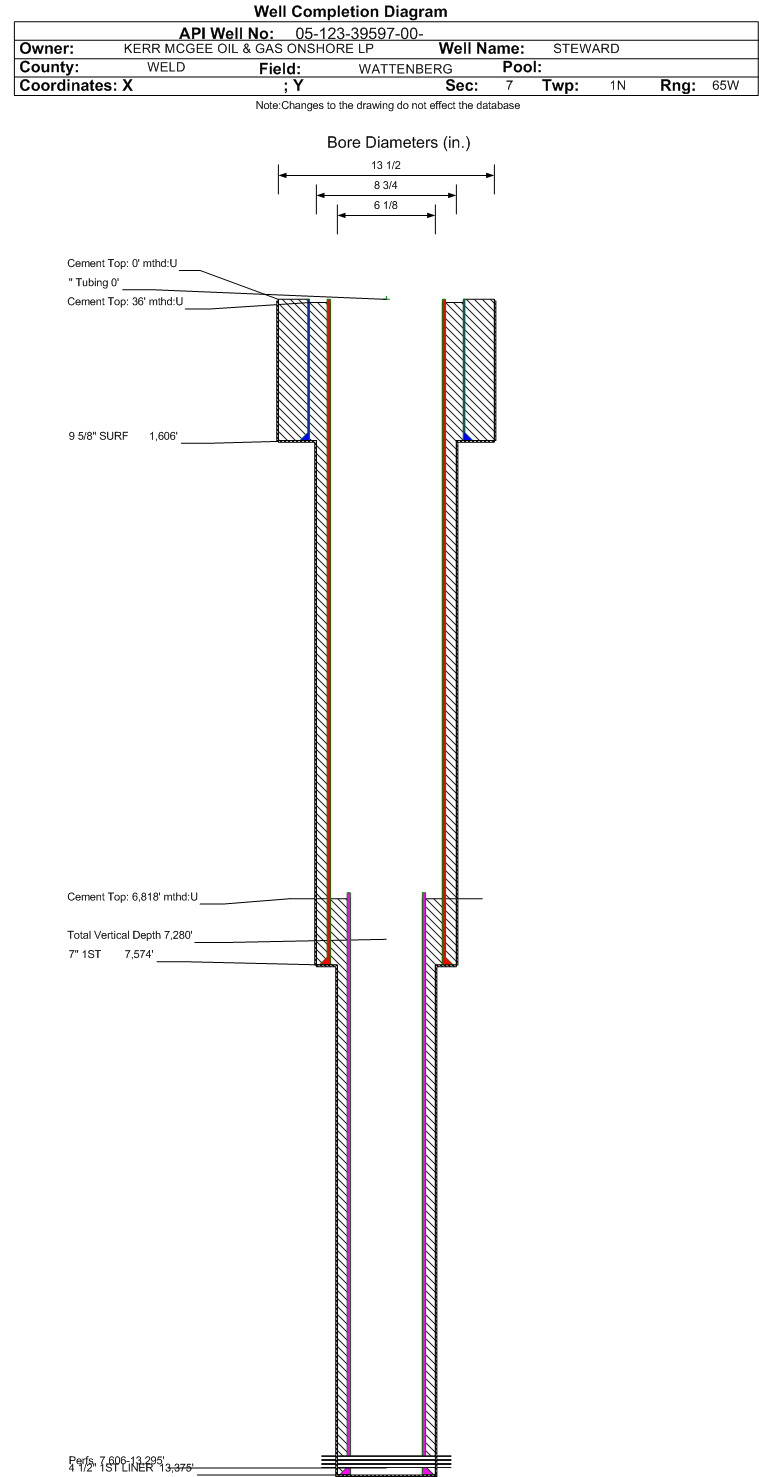 | Wellbore Completed | | Completion Date: | 2/11/2015 | | Spud Date: | 10/6/2014 | Spud Date Is: | ACTUAL | | Measured TD: | 13379 ft. | Measured PB depth: | 13327 ft. | | True Vertical TD: | 7280 ft. | True Vertical PB depth: | 7278 ft. | | Top PZ Location: | Sec:18 Twp: 1N 65W | Footage: 75 FNL 2618 FWL | | Bottom Hole Location: | Sec:6 Twp: 1N 65W | Footage: 410 FSL 2614 FEL | | Log Types: | CBL, LWD, (RESISTIVITY in 123-39593) | | Casing: | String Type: SURF, Hole Size: 13.5 in., Size: 9.625 in., Top: 0 ft., Depth: 1606 ft., Weight: 36 , Citings Type: ACTUAL | | Cement: | Sacks: 641, Top: 0 ft., Bottom: 1606 ft., Determination Method: VISU | | Casing: | String Type: 1ST, Hole Size: 8.75 in., Size: 7 in., Top: 0 ft., Depth: 7574 ft., Weight: 26 , Citings Type: ACTUAL | | Cement: | Sacks: 704, Top: 36 ft., Bottom: 7574 ft., Determination Method: CBL | | Casing: | String Type: 1ST LINER, Hole Size: 6.125 in., Size: 4.5 in., Top: 6750 ft., Depth: 13375 ft., Weight: 11.6 , Citings Type: ACTUAL | | Cement: | Sacks: 350, Top: 6818 ft., Bottom: 13375 ft., Determination Method: CALC | | Formation | Interval Top | Log Bottom | Cored | DSTs | | SUSSEX | 4561 ft. | | | | | SHARON SPRINGS | 7240 ft. | | | | | NIOBRARA | 7270 ft. | | | |