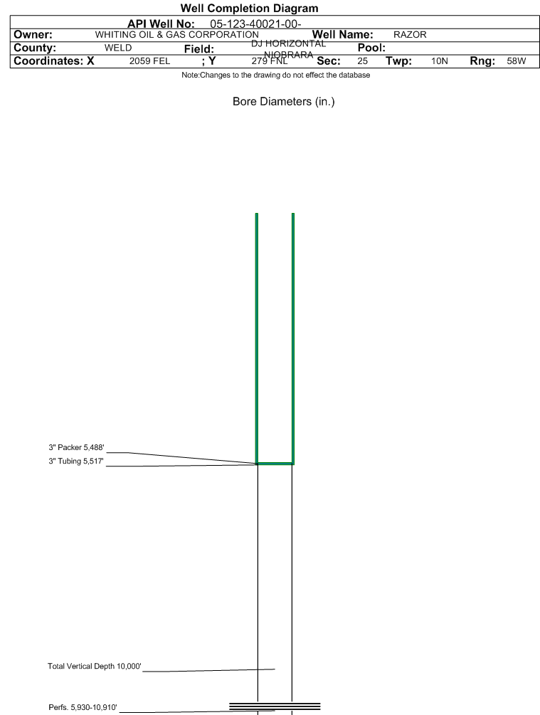 Wellbore #00 Wellbore Classification: OW Status: PR - 10/1/2017 Measured TD: 10998 ft. Vertical TD: 5585 ft.| Wellbore Data for Original Wellbore | Wellbore Classification: OW PR - 10/1/2017 | | Wellbore Permit | HORIZONTAL | | Permit #: | | Expiration Date: | 9/30/2018 | | Proposed Top PZ Location: | Sec:24 Twp: 10N 58W | Footage: 102 FSL 2490 FEL | | Bottom Hole Location: | Sec:24 Twp: 10N 58W | Footage: 100 FNL 2475 FEL | | Proposed Depth/Form: | 10989 ft. | | Surface Mineral Owner Same: | No | | Mineral Owner: | FEE | Surface Owner: | FEE | | Unit: | | Unit Number: | | | Formation And Spacing: | Code: NBRR , Formation: NIOBRARA , Order: 535-646 , Unit Acreage: 1280, Drill Unit: All Sec 24; All S.25 | | Casing: | String Type: CONDUCTOR, Hole Size: 24 in., Size: 20 in., Top: 0 ft., Depth: 80 ft., Weight: 92 , Citings Type: PLANNED | | Cement: | Sacks: 179, Top: 0 ft., Bottom: 80 ft. | | Casing: | String Type: SURF, Hole Size: 13.5 in., Size: 9.625 in., Top: 0 ft., Depth: 2000 ft., Weight: 36 , Citings Type: PLANNED | | Cement: | Sacks: 632, Top: 0 ft., Bottom: 2000 ft. | | Casing: | String Type: 1ST, Hole Size: 8.5 in., Size: 5.5 in., Top: 0 ft., Depth: 10989 ft., Weight: 17 , Citings Type: PLANNED | | Cement: | Sacks: 1751, Top: 0 ft., Bottom: 10989 ft. |