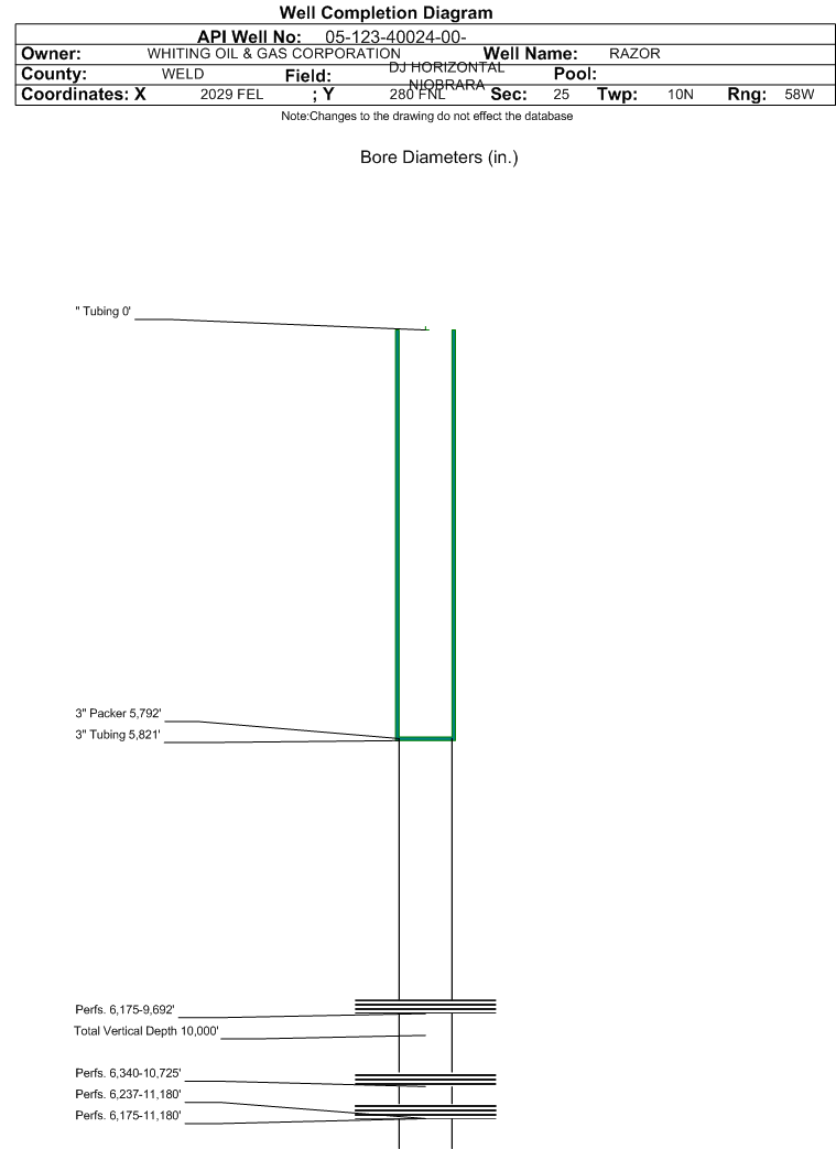 Wellbore #00 Wellbore Classification: OW Status: PR - 10/1/2017 Measured TD: 11270 ft. Vertical TD: 5862 ft.| Wellbore Data for Original Wellbore | Wellbore Classification: OW PR - 10/1/2017 | | Wellbore Permit | HORIZONTAL | | Permit #: | | Expiration Date: | 9/30/2018 | | Proposed Top PZ Location: | Sec:24 Twp: 10N 58W | Footage: 109 FSL 2356 FEL | | Bottom Hole Location: | Sec:24 Twp: 10N 58W | Footage: 100 FNL 2310 FEL | | Proposed Depth/Form: | 11265 ft. | | Surface Mineral Owner Same: | No | | Mineral Owner: | FEE | Surface Owner: | FEE | | Unit: | | Unit Number: | | | Formation And Spacing: | Code: NBRR , Formation: NIOBRARA , Order: 535-646 , Unit Acreage: 1280, Drill Unit: All S25, All S24 | | Casing: | String Type: CONDUCTOR, Hole Size: 24 in., Size: 20 in., Top: 0 ft., Depth: 80 ft., Weight: 92 , Citings Type: PLANNED | | Cement: | Sacks: 179, Top: 0 ft., Bottom: 80 ft. | | Casing: | String Type: SURF, Hole Size: 13.5 in., Size: 9.625 in., Top: 0 ft., Depth: 2000 ft., Weight: 36 , Citings Type: PLANNED | | Cement: | Sacks: 632, Top: 0 ft., Bottom: 2000 ft. | | Casing: | String Type: 1ST, Hole Size: 8.5 in., Size: 5.5 in., Top: 0 ft., Depth: 11265 ft., Weight: 17 , Citings Type: PLANNED | | Cement: | Sacks: 1788, Top: 0 ft., Bottom: 11265 ft. |