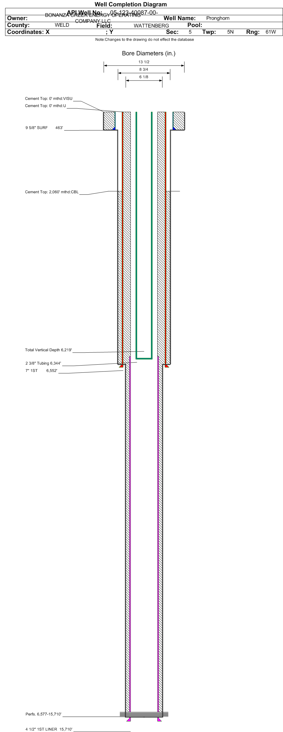 | Wellbore Completed | | Completion Date: | 10/2/2014 | | Spud Date: | 9/18/2014 | Spud Date Is: | ACTUAL | | Measured TD: | 15710 ft. | Measured PB depth: | 15710 ft. | | True Vertical TD: | 6219 ft. | True Vertical PB depth: | 6219 ft. | | Top PZ Location: | Sec:5 Twp: 5N 61W | Footage: 941 FNL 2658 FWL | | Bottom Hole Location: | Sec:8 Twp: 5N 61W | Footage: 480 FSL 2668 FWL | | Log Types: | Mud, CBL, MWD/LWD, Triple Combo. | | Casing: | String Type: SURF, Hole Size: 13.5 in., Size: 9.625 in., Top: 0 ft., Depth: 463 ft., Weight: 36 , Citings Type: ACTUAL | | Cement: | Sacks: 200, Top: 0 ft., Bottom: 463 ft., Determination Method: VISU | | Casing: | String Type: 1ST, Hole Size: 8.75 in., Size: 7 in., Top: 0 ft., Depth: 6552 ft., Weight: 26 , Citings Type: ACTUAL | | Cement: | Sacks: 715, Top: 2060 ft., Bottom: 6552 ft., Determination Method: CBL | | Casing: | String Type: 1ST LINER, Hole Size: 6.125 in., Size: 4.5 in., Top: 6344 ft., Depth: 15710 ft., Weight: 11.6 , Citings Type: ACTUAL | | Cement: | Sacks: , Top: , Bottom: , Determination Method: | | Formation | Interval Top | Log Bottom | Cored | DSTs | | PARKMAN | 3349 ft. | | | | | SHARON SPRINGS | 6040 ft. | | N | N | | NIOBRARA | 6201 ft. | | N | N |