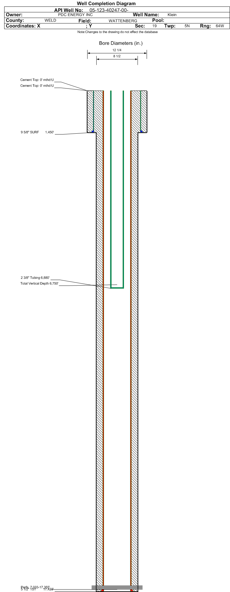 | Wellbore Completed | | Completion Date: | 10/5/2016 | | Spud Date: | 9/23/2016 | Spud Date Is: | ACTUAL | | Measured TD: | 17429 ft. | Measured PB depth: | 17399 ft. | | True Vertical TD: | 6750 ft. | True Vertical PB depth: | 6752 ft. | | Top PZ Location: | Sec:19 Twp: 5N 64W | Footage: 764 FNL 2109 FEL | | Bottom Hole Location: | Sec:21 Twp: 5N 64W | Footage: 829 FNL 2305 FEL | | Log Types: | CBL, MWD (DIL in 123-20129) | | Casing: | String Type: SURF, Hole Size: 12.25 in., Size: 9.625 in., Top: 0 ft., Depth: 1450 ft., Weight: 36 , Citings Type: ACTUAL | | Cement: | Sacks: 670, Top: 0 ft., Bottom: 1450 ft., Determination Method: VISU | | Casing: | String Type: 1ST, Hole Size: 8.5 in., Size: 5.5 in., Top: 0 ft., Depth: 17423 ft., Weight: 20 , Citings Type: ACTUAL | | Cement: | Sacks: 2501, Top: 0 ft., Bottom: 17423 ft., Determination Method: VISU | | Formation | Interval Top | Log Bottom | Cored | DSTs | | PARKMAN | 3589 ft. | | | | | SUSSEX | 4383 ft. | | | | | SHANNON | 4986 ft. | | | | | SHARON SPRINGS | 6463 ft. | | | | | NIOBRARA | 6636 ft. | | | |