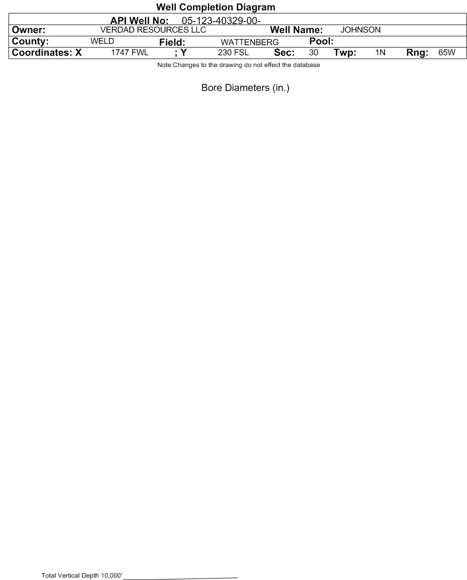 | Wellbore Completed | | Completion Date: | 11/11/2021 | | Spud Date: | 5/16/2021 | Spud Date Is: | ACTUAL | | Measured TD: | 17837 ft. | Measured PB depth: | 17755 ft. | | True Vertical TD: | 7175 ft. | True Vertical PB depth: | 7176 ft. | | Top PZ Location: | Sec:30 Twp: 1N 65W | Footage: 330 FSL 613 FWL | | Bottom Hole Location: | Sec:19 Twp: 1N 65W | Footage: 379 FNL 674 FWL | | Log Types: | | | Log Types: | MWD/LWD,CBL, RES run on Johnson 01N-65W-30-4H (API 05-123-40337) | | Casing: | String Type: CONDUCTOR, Hole Size: 26 in., Size: 16 in., Top: 0 ft., Depth: 80 ft., Weight: 65 , Citings Type: ACTUAL | | Cement: | Sacks: 70, Top: 0 ft., Bottom: 80 ft., Determination Method: VISU | | Casing: | String Type: SURF, Hole Size: 13.5 in., Size: 9.625 in., Top: 0 ft., Depth: 2314 ft., Weight: 40 , Citings Type: ACTUAL | | Cement: | Sacks: 990, Top: 0 ft., Bottom: 2314 ft., Determination Method: VISU | | Casing: | String Type: 1ST, Hole Size: 8.5 in., Size: 5.5 in., Top: 0 ft., Depth: 17837 ft., Weight: 23 , Citings Type: ACTUAL | | Cement: | Sacks: 2444, Top: 84 ft., Bottom: 17837 ft., Determination Method: CBL | | Formation | Interval Top | Log Bottom | Cored | DSTs | | FOX HILLS | 787 ft. | | | | | PARKMAN | 4304 ft. | | | | | SUSSEX | 4711 ft. | | | | | SHANNON | 5314 ft. | | | | | SHARON SPRINGS | 7369 ft. | | | | | NIOBRARA | 7384 ft. | | | |