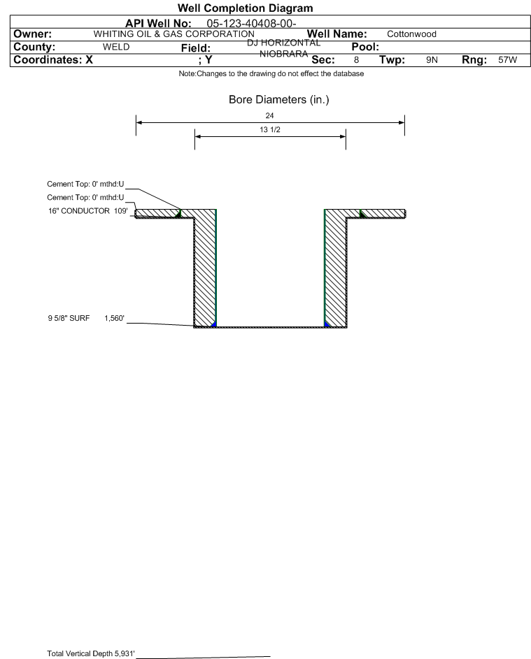| Wellbore Completed | | Completion Date: | 11/8/2014 | | Spud Date: | 11/8/2014 | Spud Date Is: | ACTUAL | | Measured TD: | 6077 ft. | Measured PB depth: | 4950 ft. | | True Vertical TD: | 5931 ft. | True Vertical PB depth: | 4801 ft. | | Bottom Hole Location: | Sec:8 Twp: 9N 57W | Footage: 2268 FSL 1268 FWL | | Log Types: | LWD, Mud, Caliper, Neutron-Density, Induction, Triple Combo, Microlog, Sonic, Porosity, Gamma Ray. | | Casing: | String Type: CONDUCTOR, Hole Size: 24 in., Size: 16 in., Top: 0 ft., Depth: 109 ft., Weight: 42.09 , Citings Type: ACTUAL | | Cement: | Sacks: 40, Top: 0 ft., Bottom: 109 ft., Determination Method: CALC | | Casing: | String Type: SURF, Hole Size: 13.5 in., Size: 9.625 in., Top: 0 ft., Depth: 1560 ft., Weight: 36.00 , Citings Type: ACTUAL | | Cement: | Sacks: 635, Top: 0 ft., Bottom: 1560 ft., Determination Method: CALC | | Formation | Interval Top | Log Bottom | Cored | DSTs | | PIERRE | 1460 ft. | | N | N | | HYGIENE | 3162 ft. | | N | N | | SHARON SPRINGS | 5382 ft. | | N | N | | NIOBRARA | 5387 ft. | | Z | N | | CODELL | 5720 ft. | | Z | N | | CARLILE | 5729 ft. | | Z | N | | No formation data to display. |