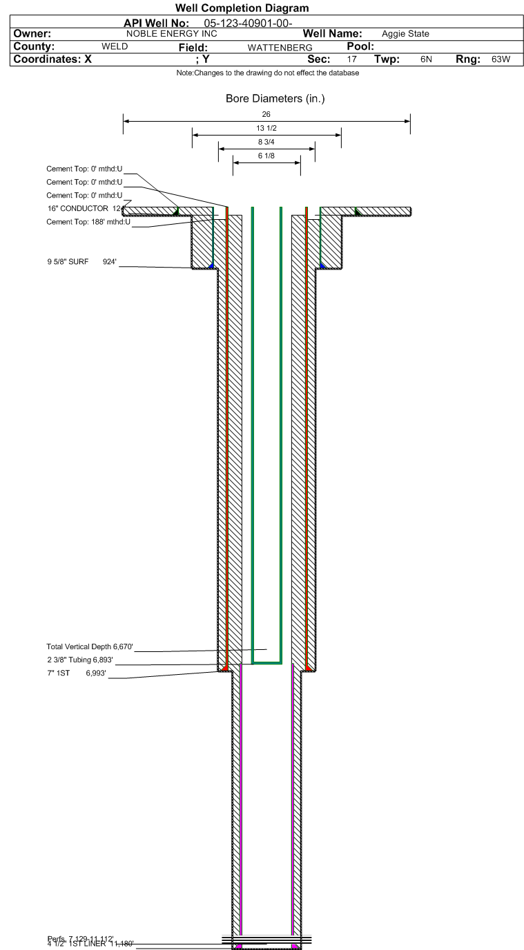 | Wellbore Completed | | Completion Date: | 2/18/2015 | | Spud Date: | 2/13/2015 | Spud Date Is: | ACTUAL | | Measured TD: | 11195 ft. | Measured PB depth: | 11168 ft. | | True Vertical TD: | 6670 ft. | True Vertical PB depth: | 6670 ft. | | Top PZ Location: | Sec:17 Twp: 6N 63W | Footage: 1141 FSL 1223 FWL | | Bottom Hole Location: | Sec:16 Twp: 6n 63w | Footage: 1164 FSL 51 FWL | | Log Types: | CBL, MWD/LWD | | Casing: | String Type: CONDUCTOR, Hole Size: 26 in., Size: 16 in., Top: 0 ft., Depth: 124 ft., Weight: 42.09 , Citings Type: ACTUAL | | Cement: | Sacks: 80, Top: 0 ft., Bottom: 124 ft., Determination Method: VISU | | Casing: | String Type: SURF, Hole Size: 13.5 in., Size: 9.625 in., Top: 0 ft., Depth: 924 ft., Weight: 36 , Citings Type: ACTUAL | | Cement: | Sacks: 337, Top: 0 ft., Bottom: 924 ft., Determination Method: VISU | | Casing: | String Type: 1ST, Hole Size: 8.75 in., Size: 7 in., Top: 0 ft., Depth: 6993 ft., Weight: 26 , Citings Type: ACTUAL | | Cement: | Sacks: 682, Top: 188 ft., Bottom: 6993 ft., Determination Method: CBL | | Casing: | String Type: 1ST LINER, Hole Size: 6.125 in., Size: 4.5 in., Top: 6884 ft., Depth: 11180 ft., Weight: 11.6 , Citings Type: ACTUAL | | Cement: | Sacks: , Top: , Bottom: , Determination Method: | | Formation | Interval Top | Log Bottom | Cored | DSTs | | PIERRE | 369 ft. | | | | | PARKMAN | 3547 ft. | | | | | SUSSEX | 4079 ft. | | | | | SHANNON | 4902 ft. | | | | | NIOBRARA | 6595 ft. | | | |