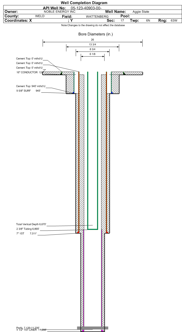 Wellbore #00 Wellbore Classification: OW Status: PR - 7/1/2020 Measured TD: 11298 ft. Vertical TD: 6670 ft.| Wellbore Data for Original Wellbore | Wellbore Classification: OW PR - 7/1/2020 | | Wellbore Permit | HORIZONTAL | | Permit #: | | Expiration Date: | 12/22/2016 | | Proposed Top PZ Location: | Sec:17 Twp: 6N 63W | Footage: 824 FSL 1060 FWL | | Bottom Hole Location: | Sec:16 Twp: 6N 63W | Footage: 825 FSL 50 FWL | | Proposed Depth/Form: | 11269 ft. | | Surface Mineral Owner Same: | No | | Mineral Owner: | FEE | Surface Owner: | FEE | | Unit: | | Unit Number: | | | Formation And Spacing: | Code: NBRR , Formation: NIOBRARA , Order: , Unit Acreage: 200, Drill Unit: GWA | | Casing: | String Type: CONDUCTOR, Hole Size: 26 in., Size: 16 in., Top: 0 ft., Depth: 100 ft., Weight: 0 , Citings Type: PLANNED | | Cement: | Sacks: 6, Top: 0 ft., Bottom: 100 ft. | | Casing: | String Type: SURF, Hole Size: 13.75 in., Size: 9.625 in., Top: 0 ft., Depth: 850 ft., Weight: 36 , Citings Type: PLANNED | | Cement: | Sacks: 400, Top: 0 ft., Bottom: 850 ft. | | Casing: | String Type: 1ST, Hole Size: 8.75 in., Size: 7 in., Top: 0 ft., Depth: 7012 ft., Weight: 26 , Citings Type: PLANNED | | Cement: | Sacks: 480, Top: , Bottom: 7012 ft. | | Casing: | String Type: 1ST LINER, Hole Size: 6.125 in., Size: 4.5 in., Top: 6862 ft., Depth: 11269 ft., Weight: 11.6 , Citings Type: PLANNED | | Cement: | Sacks: , Top: , Bottom: |