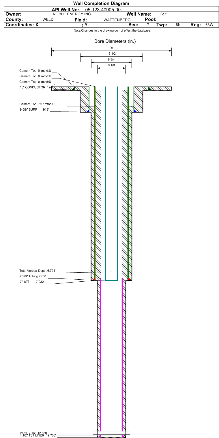 | Wellbore Completed | | Completion Date: | 3/19/2015 | | Spud Date: | 3/14/2015 | Spud Date Is: | ACTUAL | | Measured TD: | 12737 ft. | Measured PB depth: | 12724 ft. | | True Vertical TD: | 6724 ft. | True Vertical PB depth: | 6724 ft. | | Top PZ Location: | Sec:18 Twp: 6N 63W | Footage: 1155 FSL 785 FEL | | Bottom Hole Location: | Sec:13 Twp: 6N 64W | Footage: 1100 FSL 1245 FWL | | Log Types: | CBL, MWD/LWD, (Res on 05-123-27053) | | Casing: | String Type: CONDUCTOR, Hole Size: 26 in., Size: 16 in., Top: 0 ft., Depth: 124 ft., Weight: 42.5 , Citings Type: ACTUAL | | Cement: | Sacks: 80, Top: 0 ft., Bottom: 124 ft., Determination Method: VISU | | Casing: | String Type: SURF, Hole Size: 13.5 in., Size: 9.625 in., Top: 0 ft., Depth: 918 ft., Weight: 36 , Citings Type: ACTUAL | | Cement: | Sacks: 360, Top: 0 ft., Bottom: 918 ft., Determination Method: VISU | | Casing: | String Type: 1ST, Hole Size: 8.75 in., Size: 7 in., Top: 0 ft., Depth: 7032 ft., Weight: 26 , Citings Type: ACTUAL | | Cement: | Sacks: 585, Top: 710 ft., Bottom: 7032 ft., Determination Method: CBL | | Casing: | String Type: 1ST LINER, Hole Size: 6.125 in., Size: 4.5 in., Top: 6960 ft., Depth: 12733 ft., Weight: 11.6 , Citings Type: ACTUAL | | Cement: | Sacks: , Top: , Bottom: , Determination Method: | | Formation | Interval Top | Log Bottom | Cored | DSTs | | PIERRE | 936 ft. | | | | | PARKMAN | 3567 ft. | | | | | SUSSEX | 4086 ft. | | | | | SHANNON | 4963 ft. | | | | | NIOBRARA | 6639 ft. | | | |