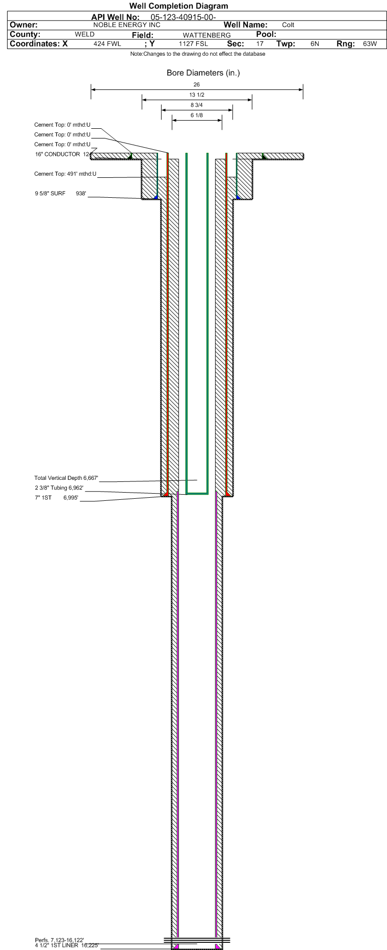 | Wellbore Completed | | Completion Date: | 4/4/2015 | | Spud Date: | 3/29/2015 | Spud Date Is: | ACTUAL | | Measured TD: | 16240 ft. | Measured PB depth: | 16223 ft. | | True Vertical TD: | 6667 ft. | True Vertical PB depth: | 6667 ft. | | Top PZ Location: | Sec:18 Twp: 6N 63W | Footage: 1616 FSL 823 FEL | | Bottom Hole Location: | Sec:13 Twp: 6N 64W | Footage: 1645 FSL 533 FWL | | Log Types: | CBL, MWD/LWD, (RES on 123-27053) | | Casing: | String Type: CONDUCTOR, Hole Size: 26 in., Size: 16 in., Top: 0 ft., Depth: 124 ft., Weight: 42.5 , Citings Type: ACTUAL | | Cement: | Sacks: 80, Top: 0 ft., Bottom: 124 ft., Determination Method: VISU | | Casing: | String Type: SURF, Hole Size: 13.5 in., Size: 9.625 in., Top: 0 ft., Depth: 938 ft., Weight: 36 , Citings Type: ACTUAL | | Cement: | Sacks: 367, Top: 0 ft., Bottom: 938 ft., Determination Method: VISU | | Casing: | String Type: 1ST, Hole Size: 8.75 in., Size: 7 in., Top: 0 ft., Depth: 6995 ft., Weight: 26 , Citings Type: ACTUAL | | Cement: | Sacks: 580, Top: 491 ft., Bottom: 6995 ft., Determination Method: CBL | | Casing: | String Type: 1ST LINER, Hole Size: 6.125 in., Size: 4.5 in., Top: 6891 ft., Depth: 16225 ft., Weight: 11.6 , Citings Type: ACTUAL | | Cement: | Sacks: , Top: , Bottom: , Determination Method: | | Formation | Interval Top | Log Bottom | Cored | DSTs | | PIERRE | 968 ft. | | | | | PARKMAN | 3581 ft. | | | | | SUSSEX | 4079 ft. | | | | | SHANNON | 4970 ft. | | | | | NIOBRARA | 6728 ft. | | | |