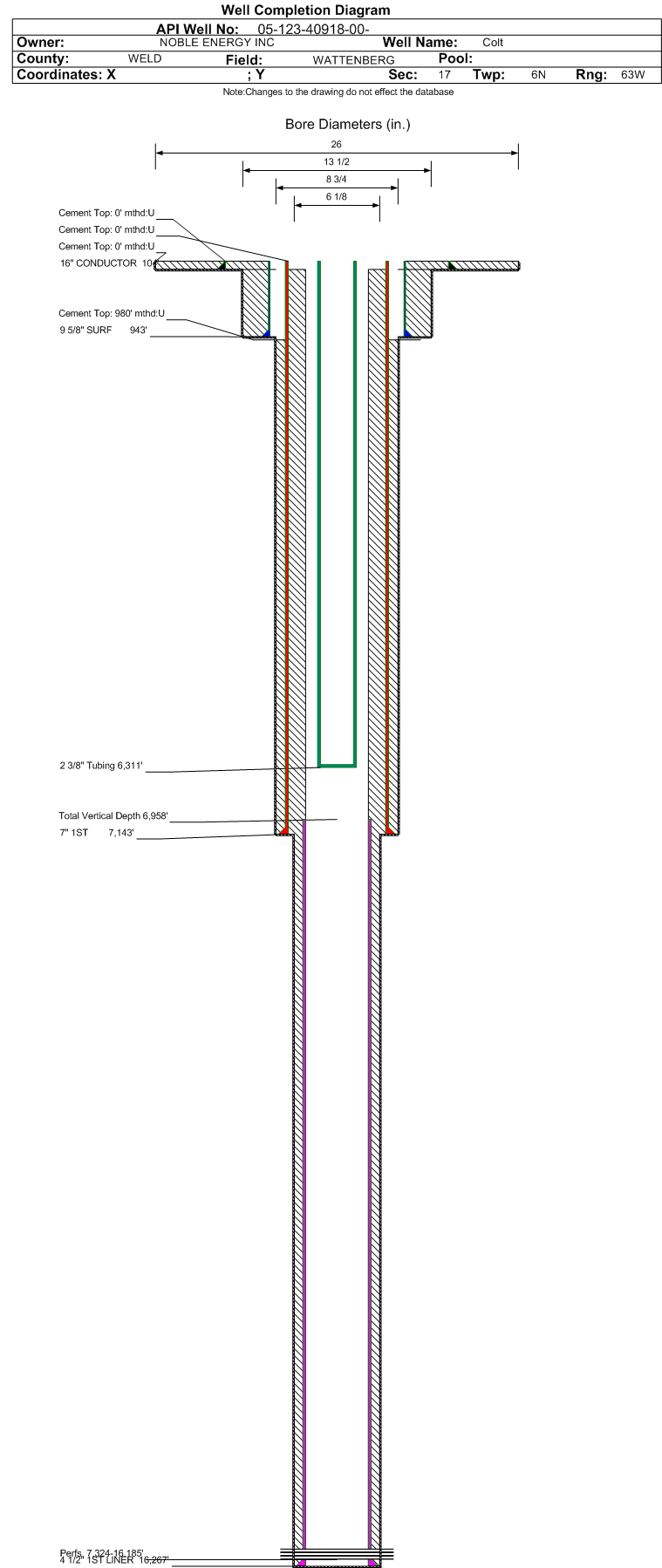 | Wellbore Completed | | Completion Date: | 3/18/2015 | | Spud Date: | 3/10/2015 | Spud Date Is: | ACTUAL | | Measured TD: | 16292 ft. | Measured PB depth: | 16258 ft. | | True Vertical TD: | 6958 ft. | True Vertical PB depth: | 6958 ft. | | Top PZ Location: | Sec:18 Twp: 6N 63W | Footage: 9 FSL 894 FEL | | Bottom Hole Location: | Sec:13 Twp: 6N 64W | Footage: 26 FSL 537 FWL | | Log Types: | CBL, MWD/LWD | | Casing: | String Type: CONDUCTOR, Hole Size: 26 in., Size: 16 in., Top: 0 ft., Depth: 104 ft., Weight: 75 , Citings Type: ACTUAL | | Cement: | Sacks: 80, Top: 0 ft., Bottom: 104 ft., Determination Method: VISU | | Casing: | String Type: SURF, Hole Size: 13.5 in., Size: 9.625 in., Top: 0 ft., Depth: 943 ft., Weight: 36 , Citings Type: ACTUAL | | Cement: | Sacks: 368, Top: 0 ft., Bottom: 943 ft., Determination Method: VISU | | Casing: | String Type: 1ST, Hole Size: 8.75 in., Size: 7 in., Top: 0 ft., Depth: 7143 ft., Weight: 26 , Citings Type: ACTUAL | | Cement: | Sacks: 581, Top: 980 ft., Bottom: 7143 ft., Determination Method: CBL | | Casing: | String Type: 1ST LINER, Hole Size: 6.125 in., Size: 4.5 in., Top: 6958 ft., Depth: 16267 ft., Weight: 11.6 , Citings Type: ACTUAL | | Cement: | Sacks: , Top: , Bottom: , Determination Method: | | Formation | Interval Top | Log Bottom | Cored | DSTs | | PIERRE | 382 ft. | | | | | PARKMAN | 3522 ft. | | | | | SUSSEX | 4089 ft. | | | | | SHANNON | 4872 ft. | | | | | NIOBRARA | 6786 ft. | | | |