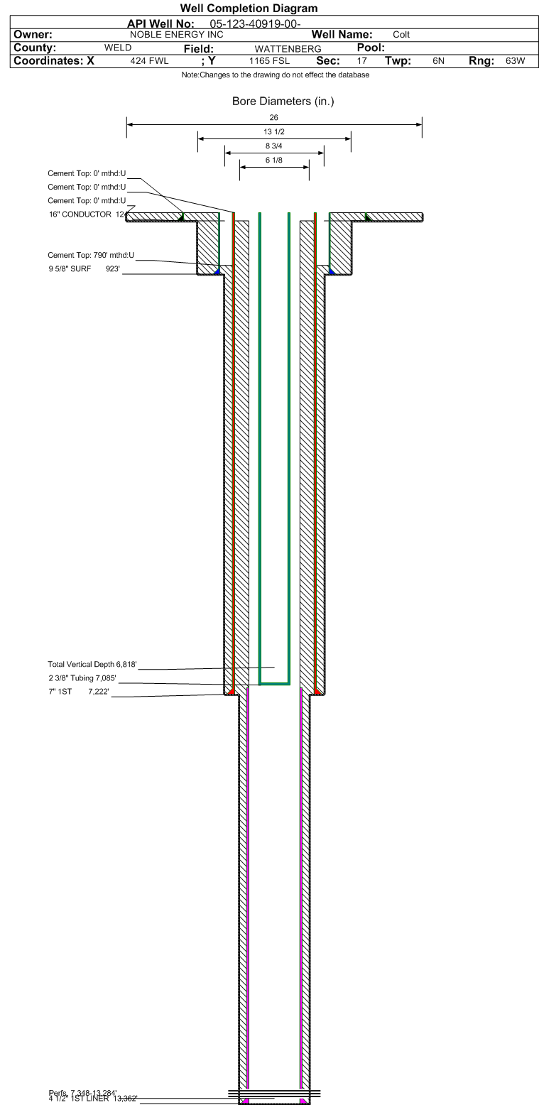 | Wellbore Completed | | Completion Date: | 4/11/2015 | | Spud Date: | 4/6/2015 | Spud Date Is: | ACTUAL | | Measured TD: | 13377 ft. | Measured PB depth: | 13360 ft. | | True Vertical TD: | 6818 ft. | True Vertical PB depth: | 6818 ft. | | Top PZ Location: | Sec:18 Twp: 6N 63W | Footage: 1793 FSL 858 FEL | | Bottom Hole Location: | Sec:13 Twp: 6N 64W | Footage: 1818 FSL 1737 FEL | | Log Types: | CBL, Mud, MWD/LWD, (RES on 123-27053) | | Casing: | String Type: CONDUCTOR, Hole Size: 26 in., Size: 16 in., Top: 0 ft., Depth: 124 ft., Weight: 42.05 , Citings Type: ACTUAL | | Cement: | Sacks: 80, Top: 0 ft., Bottom: 124 ft., Determination Method: VISU | | Casing: | String Type: SURF, Hole Size: 13.5 in., Size: 9.625 in., Top: 0 ft., Depth: 923 ft., Weight: 36 , Citings Type: ACTUAL | | Cement: | Sacks: 361, Top: 0 ft., Bottom: 923 ft., Determination Method: VISU | | Casing: | String Type: 1ST, Hole Size: 8.75 in., Size: 7 in., Top: 0 ft., Depth: 7222 ft., Weight: 26 , Citings Type: ACTUAL | | Cement: | Sacks: 602, Top: 790 ft., Bottom: 7222 ft., Determination Method: CBL | | Casing: | String Type: 1ST LINER, Hole Size: 6.125 in., Size: 4.5 in., Top: 7122 ft., Depth: 13362 ft., Weight: 11.6 , Citings Type: ACTUAL | | Cement: | Sacks: , Top: , Bottom: , Determination Method: | | Formation | Interval Top | Log Bottom | Cored | DSTs | | PIERRE | 972 ft. | | | | | PARKMAN | 3503 ft. | | | | | SUSSEX | 4105 ft. | | | | | SHANNON | 4804 ft. | | | | | NIOBRARA | 6642 ft. | | | | | NIOBRARA-FT HAYS | 7102 ft. | | | |