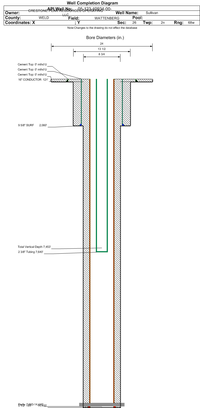 Wellbore #00 Wellbore Classification: OW Status: PR - 7/1/2018 Measured TD: 14507 ft. Vertical TD: 7453 ft.| Wellbore Data for Original Wellbore | Wellbore Classification: OW PR - 7/1/2018 | | Wellbore Permit | HORIZONTAL | | Permit #: | | Expiration Date: | 7/25/2019 | | Proposed Top PZ Location: | Sec:26 Twp: 2N 68W | Footage: 662 FSL 1589 FEL | | Bottom Hole Location: | Sec:23 Twp: 2N 68W | Footage: 2171 FNL 1711 FEL | | Proposed Depth/Form: | 14599 ft. | | Surface Mineral Owner Same: | No | | Mineral Owner: | FEE | Surface Owner: | FEE | | Unit: | | Unit Number: | | | Formation And Spacing: | Code: CODL , Formation: CODELL , Order: , Unit Acreage: 480, Drill Unit: GWA | | Formation And Spacing: | Code: NBRR , Formation: NIOBRARA , Order: , Unit Acreage: 480, Drill Unit: GWA | | Casing: | String Type: CONDUCTOR, Hole Size: 30 in., Size: 16 in., Top: 0 ft., Depth: 80 ft., Weight: 30 , Citings Type: PLANNED | | Cement: | Sacks: 80, Top: 0 ft., Bottom: 80 ft. | | Casing: | String Type: SURF, Hole Size: 13.5 in., Size: 9.625 in., Top: 0 ft., Depth: 2068 ft., Weight: 40 , Citings Type: PLANNED | | Cement: | Sacks: 878, Top: 0 ft., Bottom: 2068 ft. | | Casing: | String Type: 1ST, Hole Size: 8.75 in., Size: 5.5 in., Top: 0 ft., Depth: 14599 ft., Weight: 20 , Citings Type: PLANNED | | Cement: | Sacks: 2324, Top: 0 ft., Bottom: 14599 ft. | | Casing: | String Type: 2ND, Hole Size: 6.125 in., Size: 4.5 in., Top: 0 ft., Depth: 14795 ft., Weight: 13.5 , Citings Type: PLANNED | | Cement: | Sacks: 396, Top: 7769 ft., Bottom: 14795 ft. |