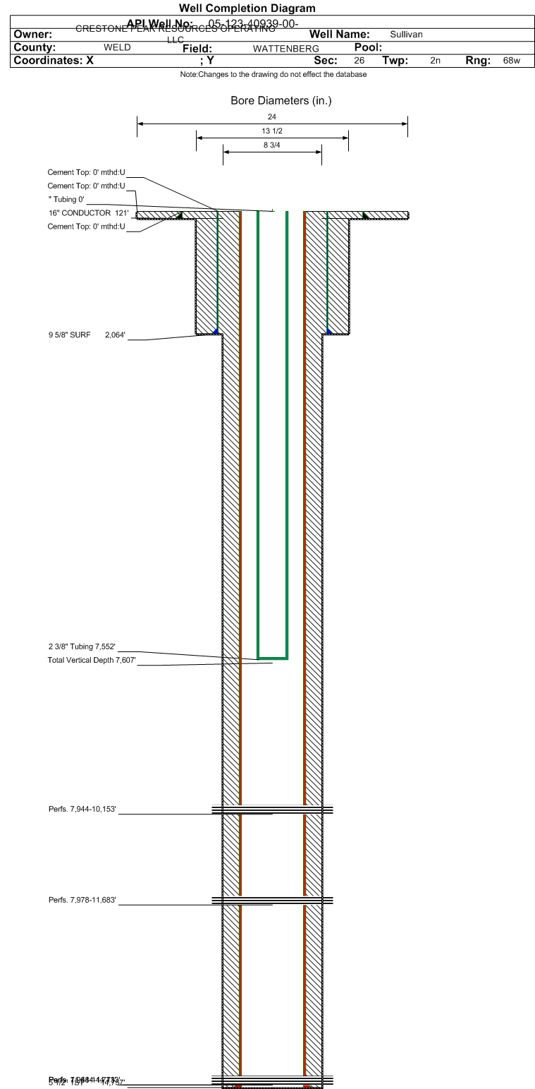 Wellbore #00 Wellbore Classification: OW Status: PR - 9/1/2025 Measured TD: 14771 ft. Vertical TD: 7607 ft.| Wellbore Data for Original Wellbore | Wellbore Classification: OW PR - 9/1/2025 | | Wellbore Permit | HORIZONTAL | | Permit #: | | Expiration Date: | 7/25/2019 | | Proposed Top PZ Location: | Sec:26 Twp: 2N 68W | Footage: 679 FSL 185 FEL | | Bottom Hole Location: | Sec:23 Twp: 2N 68W | Footage: 2172 FSL 67 FEL | | Proposed Depth/Form: | 14824 ft. | | Surface Mineral Owner Same: | No | | Mineral Owner: | FEE | Surface Owner: | FEE | | Unit: | | Unit Number: | | | Formation And Spacing: | Code: NBFHC , Formation: NIOBRARA-FT HAYS-CODELL , Order: , Unit Acreage: 480, Drill Unit: GWA | | Casing: | String Type: CONDUCTOR, Hole Size: 30 in., Size: 16 in., Top: 0 ft., Depth: 80 ft., Weight: 30 , Citings Type: PLANNED | | Cement: | Sacks: 80, Top: 0 ft., Bottom: 80 ft. | | Casing: | String Type: SURF, Hole Size: 13.5 in., Size: 9.625 in., Top: 0 ft., Depth: 2061 ft., Weight: 40 , Citings Type: PLANNED | | Cement: | Sacks: 875, Top: 0 ft., Bottom: 2061 ft. | | Casing: | String Type: 1ST, Hole Size: 8.75 in., Size: 5.5 in., Top: 0 ft., Depth: 14824 ft., Weight: 20 , Citings Type: PLANNED | | Cement: | Sacks: 2362, Top: 0 ft., Bottom: 14824 ft. | | Casing: | String Type: 2ND, Hole Size: 6.125 in., Size: 4.5 in., Top: 0 ft., Depth: 14847 ft., Weight: 13.5 , Citings Type: PLANNED | | Cement: | Sacks: 404, Top: 7683 ft., Bottom: 14847 ft. |