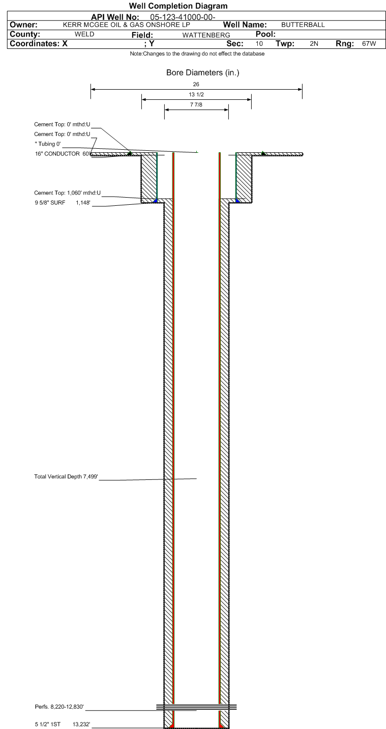 | Wellbore Completed | | Completion Date: | 4/23/2015 | | Spud Date: | 4/18/2015 | Spud Date Is: | ACTUAL | | Measured TD: | 13240 ft. | Measured PB depth: | 13139 ft. | | True Vertical TD: | 7499 ft. | True Vertical PB depth: | 7498 ft. | | Top PZ Location: | Sec:11 Twp: 2N 67W | Footage: 136 FNL 144 FWL | | Bottom Hole Location: | Sec:11 Twp: 2N 67W | Footage: 131 FSL 178 FWL | | Log Types: | CBL, LWD, Mud, (IND in 123-10810, 123-20955, 123-33788, 123-33784) | | Casing: | String Type: CONDUCTOR, Hole Size: 26 in., Size: 16 in., Top: 0 ft., Depth: 60 ft., Weight: 42.1 , Citings Type: ACTUAL | | Cement: | Sacks: 48, Top: 0 ft., Bottom: 60 ft., Determination Method: VISU | | Casing: | String Type: SURF, Hole Size: 13.5 in., Size: 9.625 in., Top: 0 ft., Depth: 1148 ft., Weight: 36 , Citings Type: ACTUAL | | Cement: | Sacks: 448, Top: 0 ft., Bottom: 1148 ft., Determination Method: VISU | | Casing: | String Type: 1ST, Hole Size: 7.875 in., Size: 5.5 in., Top: 0 ft., Depth: 13232 ft., Weight: 17 , Citings Type: ACTUAL | | Cement: | Sacks: 1312, Top: 1060 ft., Bottom: 13232 ft., Determination Method: CBL | | Formation | Interval Top | Log Bottom | Cored | DSTs | | SUSSEX | 4605 ft. | | | | | SHANNON | 4914 ft. | | | | | SHARON SPRINGS | 7442 ft. | | | | | NIOBRARA | 7546 ft. | | | | | FORT HAYS | 8006 ft. | | | | | CODELL | 8131 ft. | | | | | CARLILE | 11477 ft. | | | |