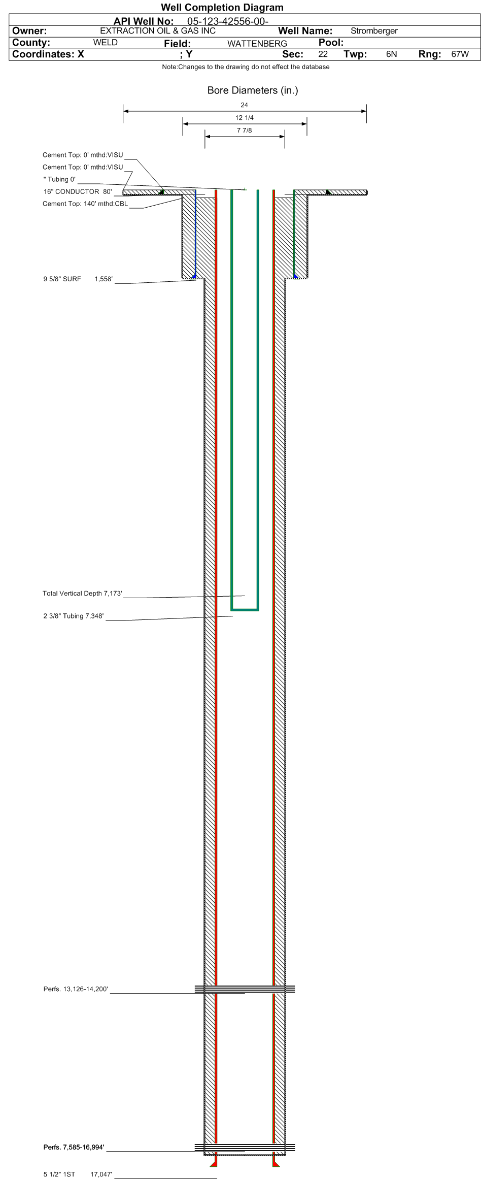 | Wellbore Completed | | Completion Date: | 3/31/2017 | | Spud Date: | 2/15/2017 | Spud Date Is: | ACTUAL | | Measured TD: | 17060 ft. | Measured PB depth: | 17047 ft. | | True Vertical TD: | 7173 ft. | True Vertical PB depth: | 7173 ft. | | Top PZ Location: | Sec:23 Twp: 6N 67W | Footage: 1759 FNL 518 FWL | | Bottom Hole Location: | Sec:24 Twp: 6N 67W | Footage: 1856 FNL 547 FEL | | Log Types: | CBL, MUD, MWD/LWD, (Dual Induction on API 123-42559). | | Casing: | String Type: CONDUCTOR, Hole Size: 24 in., Size: 16 in., Top: 0 ft., Depth: 80 ft., Weight: 42 , Citings Type: ACTUAL | | Cement: | Sacks: 100, Top: 0 ft., Bottom: 80 ft., Determination Method: VISU | | Casing: | String Type: SURF, Hole Size: 12.25 in., Size: 9.625 in., Top: 0 ft., Depth: 1558 ft., Weight: 36 , Citings Type: ACTUAL | | Cement: | Sacks: 550, Top: 0 ft., Bottom: 1558 ft., Determination Method: VISU | | Casing: | String Type: 1ST, Hole Size: 7.875 in., Size: 5.5 in., Top: 0 ft., Depth: 17047 ft., Weight: 20 , Citings Type: ACTUAL | | Cement: | Sacks: 2700, Top: 140 ft., Bottom: 17047 ft., Determination Method: CBL | | Formation | Interval Top | Log Bottom | Cored | DSTs | | PARKMAN | 3532 ft. | | N | N | | SUSSEX | 4050 ft. | | N | N | | SHANNON | 4609 ft. | | N | N | | SHARON SPRINGS | 6829 ft. | | N | N | | NIOBRARA | 6872 ft. | | N | N | | FORT HAYS | 7262 ft. | | N | N | | CODELL | 7398 ft. | | N | N |