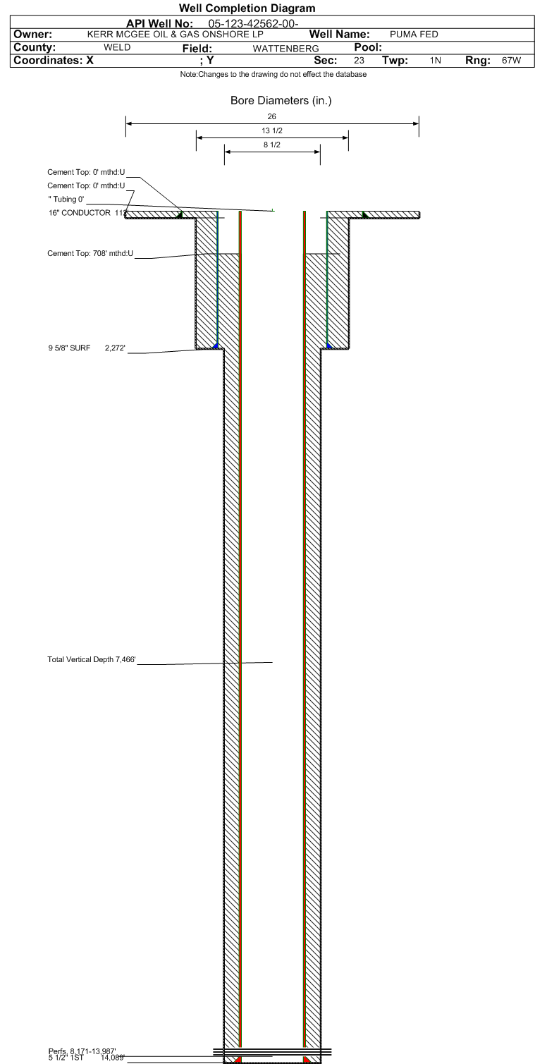 Cement:Sacks: 1850, Top: 708 ft., Bottom: 14089 ft., Determination Method: CBL