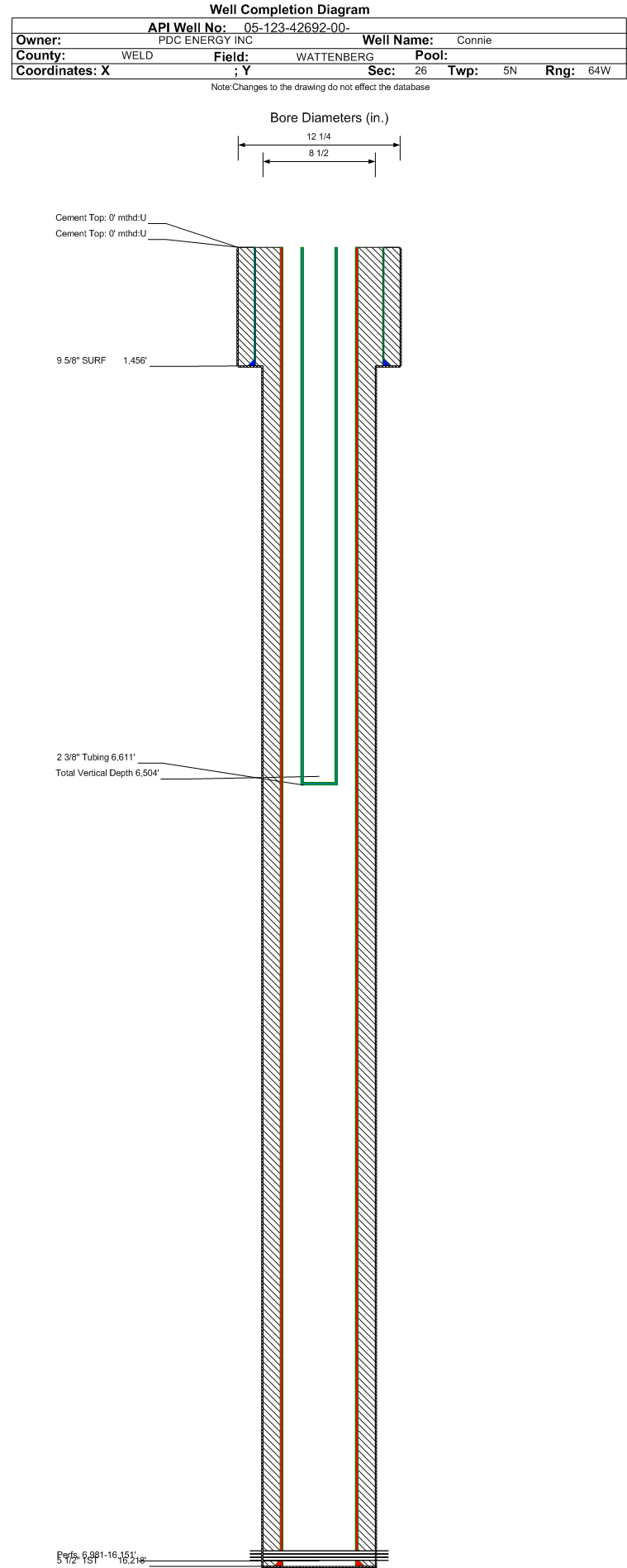 | Wellbore Completed | | Completion Date: | 5/7/2016 | | Spud Date: | 5/1/2016 | Spud Date Is: | ACTUAL | | Measured TD: | 16223 ft. | Measured PB depth: | 16203 ft. | | True Vertical TD: | 6504 ft. | True Vertical PB depth: | 6504 ft. | | Top PZ Location: | Sec:26 Twp: 5N 64W | Footage: 896 FNL 791 FWL | | Bottom Hole Location: | Sec:25 Twp: 5N 64W | Footage: 883 FNL 501 FEL | | Log Types: | CBL, MWD (DIL in 123-19303) | | Casing: | String Type: SURF, Hole Size: 12.25 in., Size: 9.625 in., Top: 0 ft., Depth: 1456 ft., Weight: 36 , Citings Type: ACTUAL | | Cement: | Sacks: 670, Top: 0 ft., Bottom: 1456 ft., Determination Method: VISU | | Casing: | String Type: 1ST, Hole Size: 8.5 in., Size: 5.5 in., Top: 0 ft., Depth: 16218 ft., Weight: 20 , Citings Type: ACTUAL | | Cement: | Sacks: 2435, Top: 0 ft., Bottom: 16218 ft., Determination Method: CBL | | Formation | Interval Top | Log Bottom | Cored | DSTs | | PARKMAN | 3484 ft. | | | | | SUSSEX | 4199 ft. | | | | | SHARON SPRINGS | 6412 ft. | | | | | NIOBRARA | 6587 ft. | | | |