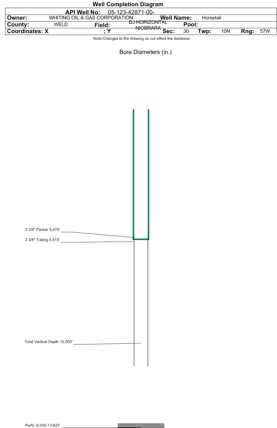 | Wellbore Completed | | Completion Date: | 10/4/2016 | | Spud Date: | 9/29/2016 | Spud Date Is: | ACTUAL | | Measured TD: | 13708 ft. | Measured PB depth: | 13663 ft. | | True Vertical TD: | 5595 ft. | True Vertical PB depth: | 5595 ft. | | Top PZ Location: | Sec:30 Twp: 10N 57W | Footage: 2407 FSL 981 FWL | | Bottom Hole Location: | Sec:31 Twp: 10N 57W | Footage: 99 FSL 836 FWL | | Log Types: | Mud log, MWD/LWD, CBL. | | Casing: | String Type: CONDUCTOR, Hole Size: 24 in., Size: 16 in., Top: 0 ft., Depth: 101 ft., Weight: 65 , Citings Type: ACTUAL | | Cement: | Sacks: 153, Top: 0 ft., Bottom: 101 ft., Determination Method: VISU | | Casing: | String Type: SURF, Hole Size: 13.5 in., Size: 9.625 in., Top: 0 ft., Depth: 2084 ft., Weight: 36 , Citings Type: ACTUAL | | Cement: | Sacks: 670, Top: 0 ft., Bottom: 2084 ft., Determination Method: VISU | | Casing: | String Type: 1ST, Hole Size: 8.5 in., Size: 5.5 in., Top: 0 ft., Depth: 13708 ft., Weight: 20 , Citings Type: ACTUAL | | Cement: | Sacks: 2755, Top: 1040 ft., Bottom: 13708 ft., Determination Method: CBL | | Formation | Interval Top | Log Bottom | Cored | DSTs | | PIERRE | 1405 ft. | | N | N | | HYGIENE | 3145 ft. | | N | N | | SUSSEX | 3852 ft. | | N | N | | SHARON SPRINGS | 5819 ft. | | N | N | | NIOBRARA | 5825 ft. | | N | N |