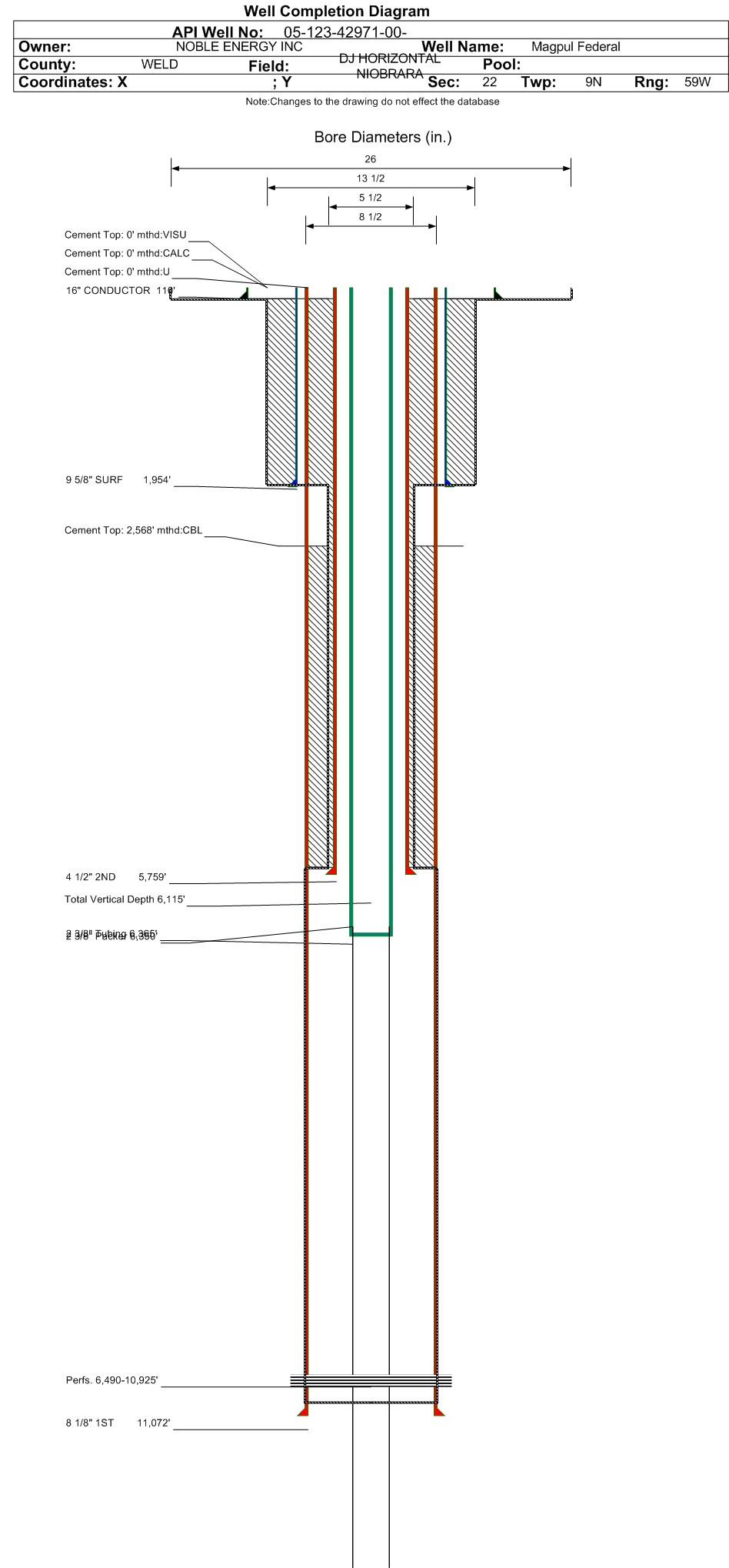 | Wellbore Completed | | Completion Date: | 5/26/2017 | | Spud Date: | 5/22/2017 | Spud Date Is: | ACTUAL | | Measured TD: | 11082 ft. | Measured PB depth: | 11021 ft. | | True Vertical TD: | 6115 ft. | True Vertical PB depth: | 6115 ft. | | Top PZ Location: | Sec:21 Twp: 9N 59W | Footage: 1214 FNL 361 FEL | | Bottom Hole Location: | Sec:21 Twp: 9N 59W | Footage: 1212 FNL 328 FWL | | Log Types: | CBL, MWD/LWD, MUD, (DIL in 123-42969 & 123-42632) | | Log Types: | | | Casing: | String Type: CONDUCTOR, Hole Size: 26 in., Size: 16 in., Top: 0 ft., Depth: 110 ft., Weight: 42.09 , Citings Type: ACTUAL | | Cement: | Sacks: 64, Top: 0 ft., Bottom: 110 ft., Determination Method: CALC | | Casing: | String Type: SURF, Hole Size: 13.5 in., Size: 9.625 in., Top: 0 ft., Depth: 1954 ft., Weight: 36 , Citings Type: ACTUAL | | Cement: | Sacks: 694, Top: 0 ft., Bottom: 1954 ft., Determination Method: VISU | | Casing: | String Type: 1ST, Hole Size: 8.5 in., Size: 8.2 in., Top: 0 ft., Depth: 11072 ft., Weight: 20 , Citings Type: ACTUAL | | Cement: | Sacks: 1168, Top: 2568 ft., Bottom: 11072 ft., Determination Method: CBL | | Casing: | String Type: 2ND, Hole Size: 5.5 in., Size: 4.5 in., Top: 0 ft., Depth: 5759 ft., Weight: 11.6 , Citings Type: ACTUAL | | Cement: | Sacks: , Top: , Bottom: , Determination Method: | | Formation | Interval Top | Log Bottom | Cored | DSTs | | PARKMAN | 3287 ft. | | | | | SUSSEX | 4093 ft. | | | | | SHANNON | 4580 ft. | | | | | TEEPEE BUTTES | 5384 ft. | | | | | NIOBRARA | 6068 ft. | | | |
