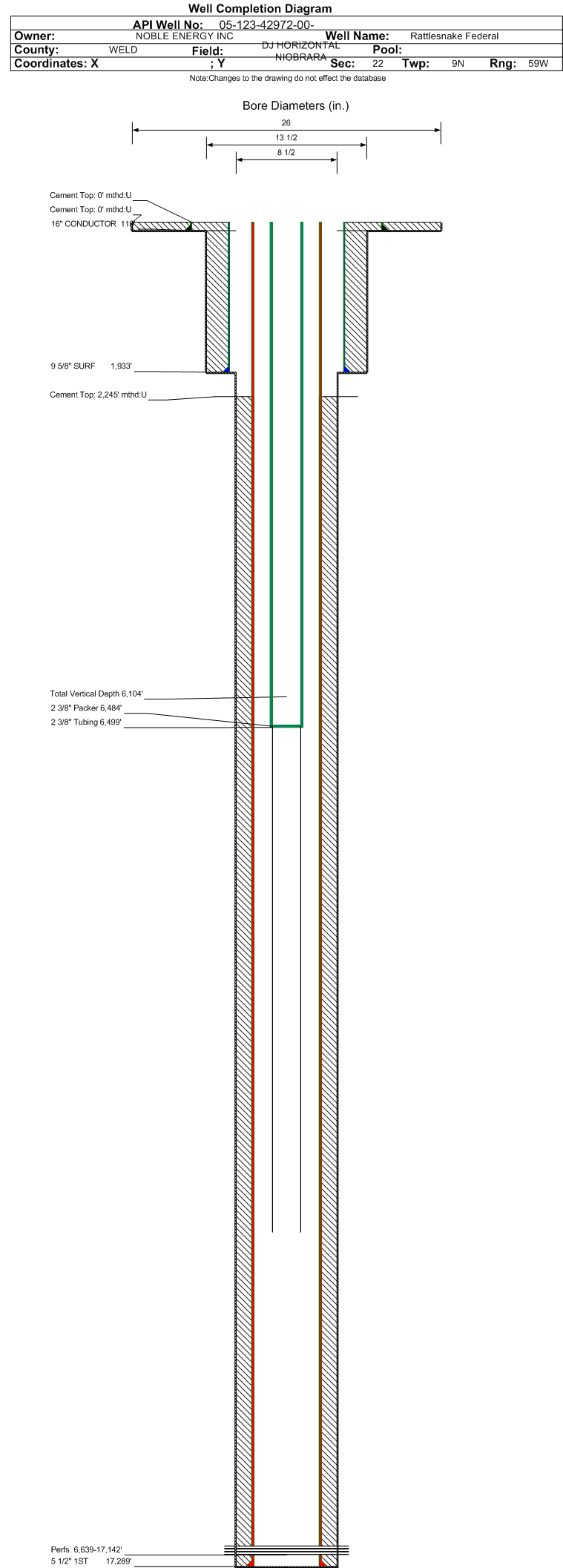 Wellbore #00 Wellbore Classification: OW Status: SI - 11/1/2025 Measured TD: 17299 ft. Vertical TD: 6104 ft.| Wellbore Data for Original Wellbore | Wellbore Classification: OW SI - 11/1/2025 | | Wellbore Permit | HORIZONTAL | | Permit #: | | Expiration Date: | 3/28/2018 | | Proposed Top PZ Location: | Sec:22 Twp: 9N 59W | Footage: 400 FNL 328 FWL | | Bottom Hole Location: | Sec:10 Twp: 9N 59W | Footage: 330 FNL 330 FWL | | Proposed Depth/Form: | 16478 ft. | | Surface Mineral Owner Same: | No | | Mineral Owner: | FEE | Surface Owner: | FEE | | Unit: | | Unit Number: | | | Formation And Spacing: | Code: NBRR , Formation: NIOBRARA , Order: 535-681 , Unit Acreage: 3840, Drill Unit: S:10,11,14,15,22,23 | | Casing: | String Type: CONDUCTOR, Hole Size: 26 in., Size: 16 in., Top: 0 ft., Depth: 80 ft., Weight: 42 , Citings Type: PLANNED | | Cement: | Sacks: 6, Top: 0 ft., Bottom: 80 ft. | | Casing: | String Type: SURF, Hole Size: 13.5 in., Size: 9.625 in., Top: 0 ft., Depth: 1850 ft., Weight: 36 , Citings Type: PLANNED | | Cement: | Sacks: 535, Top: 0 ft., Bottom: 1850 ft. | | Casing: | String Type: 1ST, Hole Size: 8.5 in., Size: 5.5 in., Top: 0 ft., Depth: 17307 ft., Weight: 20 , Citings Type: PLANNED | | Cement: | Sacks: 1816, Top: , Bottom: | | Casing: | String Type: 1ST LINER, Hole Size: 6.125 in., Size: 4.5 in., Top: 6385 ft., Depth: 16478 ft., Weight: 11.6 , Citings Type: PLANNED | | Cement: | Sacks: , Top: , Bottom: |