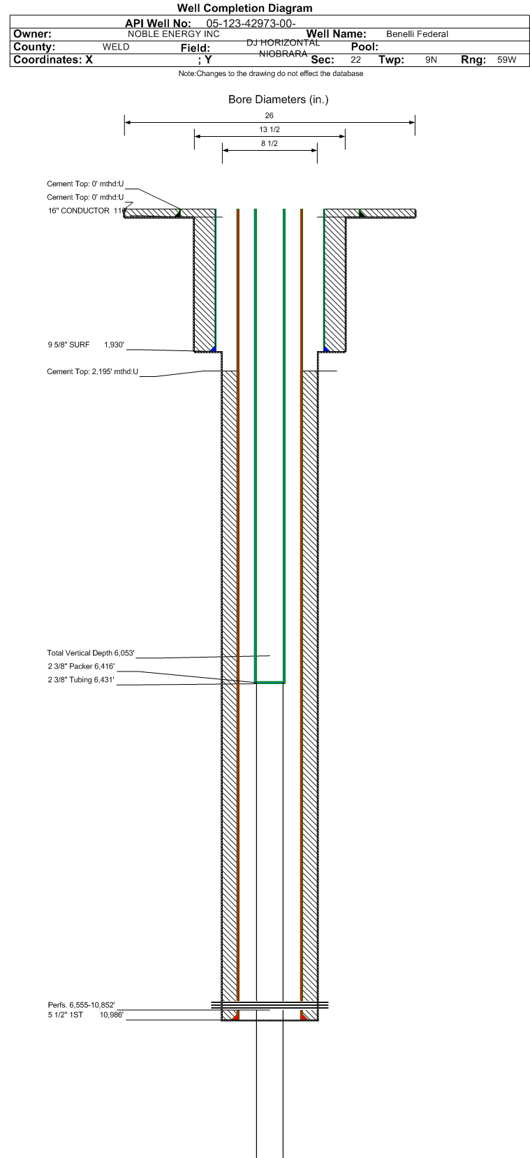| Wellbore Completed | | Completion Date: | 3/7/2017 | | Spud Date: | 3/3/2016 | Spud Date Is: | ACTUAL | | Measured TD: | 10994 ft. | Measured PB depth: | 10940 ft. | | True Vertical TD: | 6053 ft. | True Vertical PB depth: | 6053 ft. | | Top PZ Location: | Sec:22 Twp: 9N 59W | Footage: 463 FNL 2568 FEL | | Bottom Hole Location: | Sec:10 Twp: 9N 59W | Footage: 332 FSL 2524 FEL | | Log Types: | MWD/LWD, CBL, (DIL in API 123-42969) | | Casing: | String Type: CONDUCTOR, Hole Size: 26 in., Size: 16 in., Top: 0 ft., Depth: 110 ft., Weight: 42.09 , Citings Type: ACTUAL | | Cement: | Sacks: 64, Top: 0 ft., Bottom: 110 ft., Determination Method: VISU | | Casing: | String Type: SURF, Hole Size: 13.5 in., Size: 9.625 in., Top: 0 ft., Depth: 1930 ft., Weight: 36 , Citings Type: ACTUAL | | Cement: | Sacks: 660, Top: 0 ft., Bottom: 1930 ft., Determination Method: VISU | | Casing: | String Type: 1ST, Hole Size: 8.5 in., Size: 5.5 in., Top: 0 ft., Depth: 10986 ft., Weight: 20 , Citings Type: ACTUAL | | Cement: | Sacks: 1171, Top: 2195 ft., Bottom: 10986 ft., Determination Method: CBL | | Formation | Interval Top | Log Bottom | Cored | DSTs | | PIERRE | 751 ft. | | | | | PARKMAN | 3500 ft. | | | | | SUSSEX | 4190 ft. | | | | | SHANNON | 4726 ft. | | | | | TEEPEE BUTTES | 5470 ft. | | | | | NIOBRARA | 6287 ft. | | | |