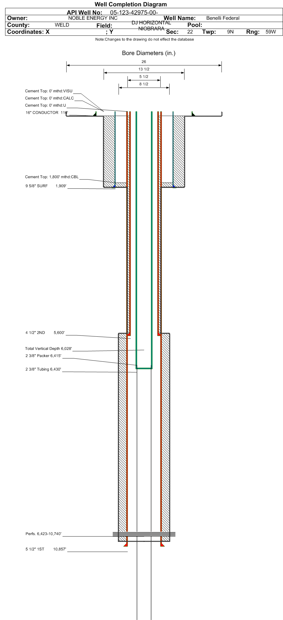 Wellbore #00 Wellbore Classification: OW Status: PR - 7/1/2020 Measured TD: 10866 ft. Vertical TD: 6028 ft.| Wellbore Data for Original Wellbore | Wellbore Classification: OW PR - 7/1/2020 | | Wellbore Permit | HORIZONTAL | | Permit #: | | Expiration Date: | 3/28/2018 | | Proposed Top PZ Location: | Sec:22 Twp: 9N 59W | Footage: 519 FNL 1920 FWL | | Bottom Hole Location: | Sec:22 Twp: 9N 59W | Footage: 331 FSL 1929 FWL | | Proposed Depth/Form: | 10482 ft. | | Surface Mineral Owner Same: | No | | Mineral Owner: | FEE | Surface Owner: | FEE | | Unit: | | Unit Number: | | | Formation And Spacing: | Code: NBRR , Formation: NIOBRARA , Order: 535-681 , Unit Acreage: 3840, Drill Unit: S:10,11,14,15,22,23 | | Casing: | String Type: CONDUCTOR, Hole Size: 26 in., Size: 16 in., Top: 0 ft., Depth: 80 ft., Weight: 42 , Citings Type: PLANNED | | Cement: | Sacks: 6, Top: 0 ft., Bottom: 80 ft. | | Casing: | String Type: SURF, Hole Size: 13.5 in., Size: 9.625 in., Top: 0 ft., Depth: 1850 ft., Weight: 36 , Citings Type: PLANNED | | Cement: | Sacks: 535, Top: 0 ft., Bottom: 1850 ft. | | Casing: | String Type: 1ST, Hole Size: 8.5 in., Size: 5.5 in., Top: 0 ft., Depth: 10979 ft., Weight: 20 , Citings Type: PLANNED | | Cement: | Sacks: 1052, Top: , Bottom: | | Casing: | String Type: 1ST LINER, Hole Size: 6.125 in., Size: 4.5 in., Top: 6274 ft., Depth: 10482 ft., Weight: 11.6 , Citings Type: PLANNED | | Cement: | Sacks: , Top: , Bottom: |