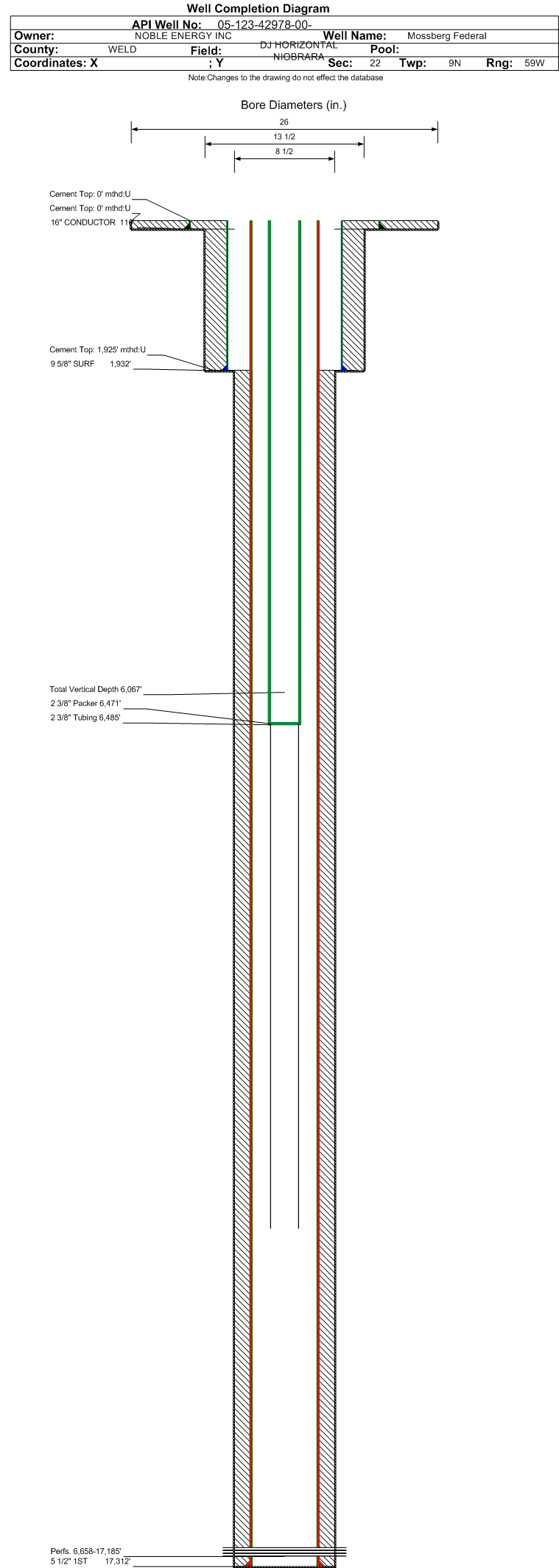 | Wellbore Completed | | Completion Date: | 2/24/2017 | | Spud Date: | 2/19/2017 | Spud Date Is: | ACTUAL | | Measured TD: | 17332 ft. | Measured PB depth: | 17273 ft. | | True Vertical TD: | 6067 ft. | True Vertical PB depth: | 6067 ft. | | Top PZ Location: | Sec:22 Twp: 9N 59W | Footage: 366 FNL 2517 FWL | | Bottom Hole Location: | Sec:10 Twp: 9N 59W | Footage: 332 FNL 2475 FWL | | Log Types: | CBL, MWD/LWD, (DIL in API 123-42969) | | Casing: | String Type: CONDUCTOR, Hole Size: 26 in., Size: 16 in., Top: 0 ft., Depth: 110 ft., Weight: 42.09 , Citings Type: ACTUAL | | Cement: | Sacks: 64, Top: 0 ft., Bottom: 110 ft., Determination Method: VISU | | Casing: | String Type: SURF, Hole Size: 13.5 in., Size: 9.625 in., Top: 0 ft., Depth: 1932 ft., Weight: 36 , Citings Type: ACTUAL | | Cement: | Sacks: 660, Top: 0 ft., Bottom: 1932 ft., Determination Method: VISU | | Casing: | String Type: 1ST, Hole Size: 8.5 in., Size: 5.5 in., Top: 0 ft., Depth: 17312 ft., Weight: 20 , Citings Type: ACTUAL | | Cement: | Sacks: 1911, Top: 1925 ft., Bottom: 17312 ft., Determination Method: CBL | | Formation | Interval Top | Log Bottom | Cored | DSTs | | PIERRE | 754 ft. | | | | | PARKMAN | 3499 ft. | | | | | SUSSEX | 4136 ft. | | | | | SHANNON | 4675 ft. | | | | | TEEPEE BUTTES | 5489 ft. | | | | | NIOBRARA | 6222 ft. | | | |