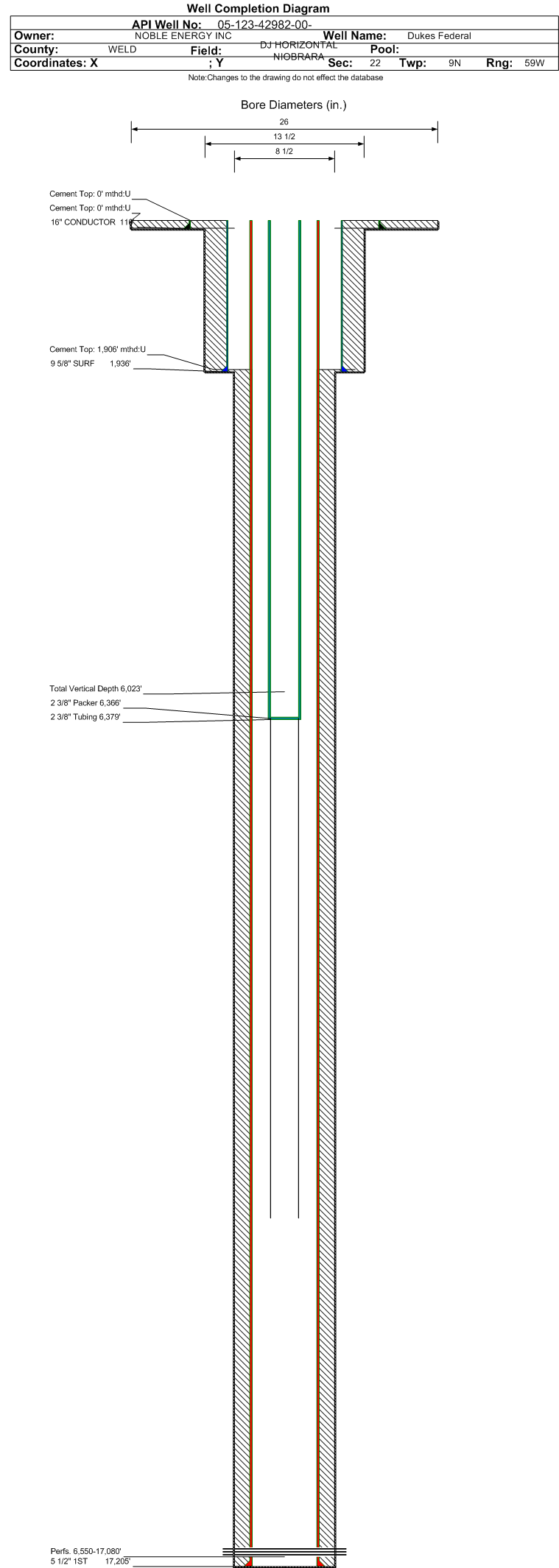 | Wellbore Completed | | Completion Date: | 2/23/2017 | | Spud Date: | 2/18/2017 | Spud Date Is: | ACTUAL | | Measured TD: | 17216 ft. | Measured PB depth: | 17163 ft. | | True Vertical TD: | 6023 ft. | True Vertical PB depth: | 6023 ft. | | Top PZ Location: | Sec:15 Twp: 9N 59W | Footage: 400 FNL 2475 FEL | | Bottom Hole Location: | Sec:10 Twp: 9N 59W | Footage: 337 FNL 1415 FEL | | Log Types: | CBL, MWD/LWD, Resistivity | | Casing: | String Type: CONDUCTOR, Hole Size: 26 in., Size: 16 in., Top: 0 ft., Depth: 110 ft., Weight: 42.09 , Citings Type: ACTUAL | | Cement: | Sacks: 64, Top: 0 ft., Bottom: 100 ft., Determination Method: VISU | | Casing: | String Type: SURF, Hole Size: 13.5 in., Size: 9.625 in., Top: 0 ft., Depth: 1936 ft., Weight: 36 , Citings Type: ACTUAL | | Cement: | Sacks: 671, Top: 0 ft., Bottom: 1936 ft., Determination Method: VISU | | Casing: | String Type: 1ST, Hole Size: 8.5 in., Size: 5.5 in., Top: 0 ft., Depth: 17205 ft., Weight: 20 , Citings Type: ACTUAL | | Cement: | Sacks: 1895, Top: 1906 ft., Bottom: 17216 ft., Determination Method: CBL | | Formation | Interval Top | Log Bottom | Cored | DSTs | | PARKMAN | 3443 ft. | | | | | SUSSEX | 4152 ft. | | | | | TEEPEE BUTTES | 5388 ft. | | | | | SHANNON | 6162 ft. | | | | | NIOBRARA | 6178 ft. | | | |
