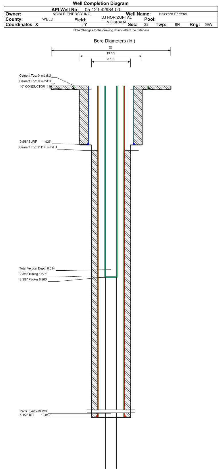 Wellbore #00 Wellbore Classification: OW Status: PR - 7/1/2020 Measured TD: 10850 ft. Vertical TD: 6014 ft.| Wellbore Data for Original Wellbore | Wellbore Classification: OW PR - 7/1/2020 | | Wellbore Permit | HORIZONTAL | | Permit #: | | Expiration Date: | 3/28/2018 | | Proposed Top PZ Location: | Sec:22 Twp: 9N 59W | Footage: 500 FNL 1654 FEL | | Bottom Hole Location: | Sec:22 Twp: 9N 59W | Footage: 330 FSL 1650 FEL | | Proposed Depth/Form: | 10444 ft. | | Surface Mineral Owner Same: | No | | Mineral Owner: | FEE | Surface Owner: | FEE | | Unit: | | Unit Number: | | | Formation And Spacing: | Code: NBRR , Formation: NIOBRARA , Order: 535-681 , Unit Acreage: 3840, Drill Unit: S:10,11,14,15,22,23 | | Casing: | String Type: CONDUCTOR, Hole Size: 26 in., Size: 16 in., Top: 0 ft., Depth: 80 ft., Weight: 42 , Citings Type: PLANNED | | Cement: | Sacks: 6, Top: 0 ft., Bottom: 80 ft. | | Casing: | String Type: SURF, Hole Size: 13.5 in., Size: 9.625 in., Top: 0 ft., Depth: 1850 ft., Weight: 36 , Citings Type: PLANNED | | Cement: | Sacks: 535, Top: 0 ft., Bottom: 1850 ft. | | Casing: | String Type: 1ST, Hole Size: 8.5 in., Size: 5.5 in., Top: 0 ft., Depth: 10896 ft., Weight: 20 , Citings Type: PLANNED | | Cement: | Sacks: 1042, Top: , Bottom: | | Casing: | String Type: 1ST LINER, Hole Size: 6.125 in., Size: 4.5 in., Top: 6247 ft., Depth: 10444 ft., Weight: 11.6 , Citings Type: PLANNED | | Cement: | Sacks: , Top: , Bottom: |