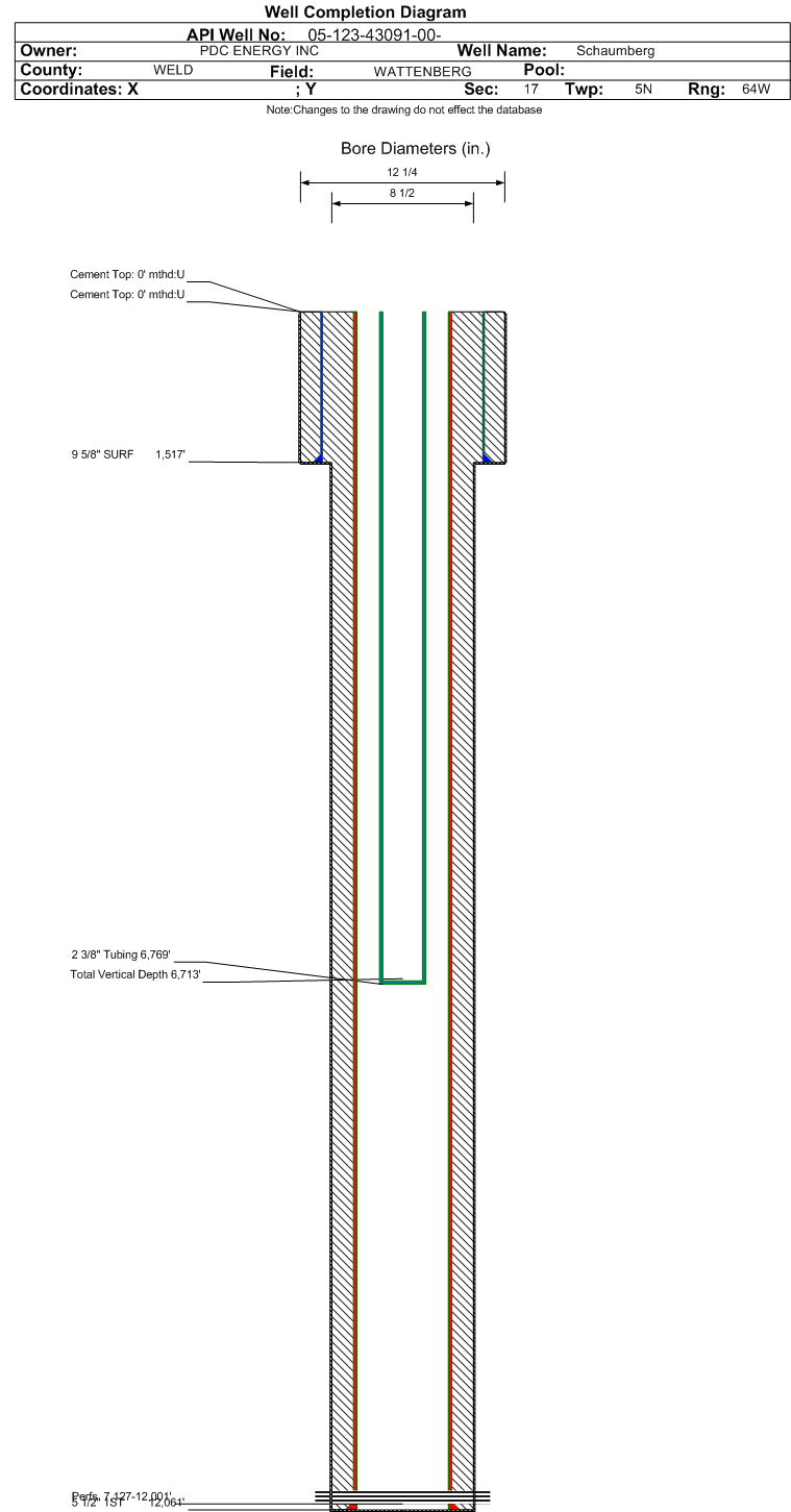 | Wellbore Completed | | Completion Date: | 7/17/2016 | | Spud Date: | 7/12/2016 | Spud Date Is: | ACTUAL | | Measured TD: | 12092 ft. | Measured PB depth: | 12046 ft. | | True Vertical TD: | 6713 ft. | True Vertical PB depth: | 6715 ft. | | Top PZ Location: | Sec:18 Twp: 5N 64W | Footage: 1385 FNL 35 FEL | | Bottom Hole Location: | Sec:18 Twp: 5N 64W | Footage: 1305 FNL 106 FEL | | Log Types: | CBL, MWD (DIL in 123-43088-00) | | Casing: | String Type: SURF, Hole Size: 12.25 in., Size: 9.625 in., Top: 0 ft., Depth: 1517 ft., Weight: 36 , Citings Type: ACTUAL | | Cement: | Sacks: 720, Top: 0 ft., Bottom: 1517 ft., Determination Method: VISU | | Casing: | String Type: 1ST, Hole Size: 8.5 in., Size: 5.5 in., Top: 0 ft., Depth: 12061 ft., Weight: 20 , Citings Type: ACTUAL | | Cement: | Sacks: 1980, Top: 0 ft., Bottom: 12061 ft., Determination Method: VISU | | Formation | Interval Top | Log Bottom | Cored | DSTs | | PARKMAN | 3527 ft. | | | | | SUSSEX | 4247 ft. | | | | | SHANNON | 4997 ft. | | | | | SHARON SPRINGS | 6494 ft. | | | | | NIOBRARA | 6653 ft. | | | |