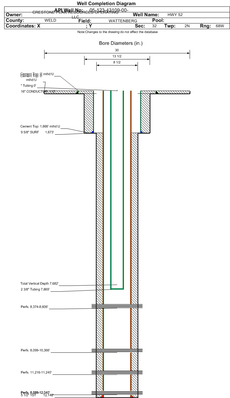 | Wellbore Completed | | Completion Date: | 8/16/2017 | | Spud Date: | 3/11/2017 | Spud Date Is: | ACTUAL | | Measured TD: | 12162 ft. | Measured PB depth: | 12103 ft. | | True Vertical TD: | 7682 ft. | True Vertical PB depth: | 7683 ft. | | Top PZ Location: | Sec:32 Twp: 2N 68W | Footage: 780 FSL 852 FEL | | Bottom Hole Location: | Sec:32 Twp: 2N 68W | Footage: 491 FNL 928 FEL | | Log Types: | Mud Log, MWD/LWD, CBL. (Resistivity in123-38246) | | Casing: | String Type: CONDUCTOR, Hole Size: 30 in., Size: 16 in., Top: 0 ft., Depth: 112 ft., Weight: 65 , Citings Type: ACTUAL | | Cement: | Sacks: 190, Top: 0 ft., Bottom: 112 ft., Determination Method: VISU | | Casing: | String Type: SURF, Hole Size: 13.5 in., Size: 9.625 in., Top: 0 ft., Depth: 1673 ft., Weight: 36 , Citings Type: ACTUAL | | Cement: | Sacks: 638, Top: 0 ft., Bottom: 1673 ft., Determination Method: VISU | | Casing: | String Type: 1ST, Hole Size: 8.5 in., Size: 5.5 in., Top: 0 ft., Depth: 12142 ft., Weight: 20 , Citings Type: ACTUAL | | Cement: | Sacks: 1446, Top: 1666 ft., Bottom: 12162 ft., Determination Method: CBL | | Formation | Interval Top | Log Bottom | Cored | DSTs | | SUSSEX | 4505 ft. | | | | | SHANNON | 5045 ft. | | | | | TEEPEE BUTTES | 6603 ft. | | | | | SHARON SPRINGS | 7450 ft. | | | | | NIOBRARA | 7571 ft. | | | | | FORT HAYS | 8167 ft. | | | | | CODELL | 8628 ft. | | | | | CARLILE | 10945 ft. | | | |