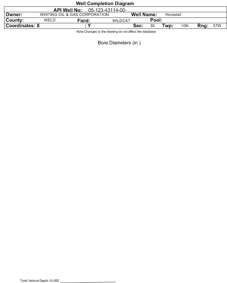 Wellbore #00 Wellbore Classification: Status: AL - 5/31/2018 Measured TD: | Wellbore Data for Original Wellbore | Wellbore Classification: AL - 5/31/2018 | | Wellbore Permit | HORIZONTAL | | Permit #: | | Expiration Date: | 4/21/2018 | | Proposed Top PZ Location: | Sec:30 Twp: 10N 57W | Footage: 2561 FSL 681 FEL | | Bottom Hole Location: | Sec:31 Twp: 10N 57W | Footage: 100 FSL 863 FEL | | Proposed Depth/Form: | 13680 ft. | | Surface Mineral Owner Same: | No | | Mineral Owner: | FEE | Surface Owner: | FEE | | Unit: | | Unit Number: | | | Formation And Spacing: | Code: NBRR , Formation: NIOBRARA , Order: 535-508 , Unit Acreage: 960, Drill Unit: S/2 30, All 31 | | Casing: | String Type: CONDUCTOR, Hole Size: 24 in., Size: 16 in., Top: 0 ft., Depth: 80 ft., Weight: 65 , Citings Type: PLANNED | | Cement: | Sacks: 179, Top: 0 ft., Bottom: 80 ft. | | Casing: | String Type: SURF, Hole Size: 13.5 in., Size: 9.625 in., Top: 0 ft., Depth: 1550 ft., Weight: 36 , Citings Type: PLANNED | | Cement: | Sacks: 695, Top: 0 ft., Bottom: 1550 ft. | | Casing: | String Type: 1ST, Hole Size: 8.75 in., Size: 5.5 in., Top: 0 ft., Depth: 13680 ft., Weight: 17 , Citings Type: PLANNED | | Cement: | Sacks: 1998, Top: 0 ft., Bottom: 13680 ft. |