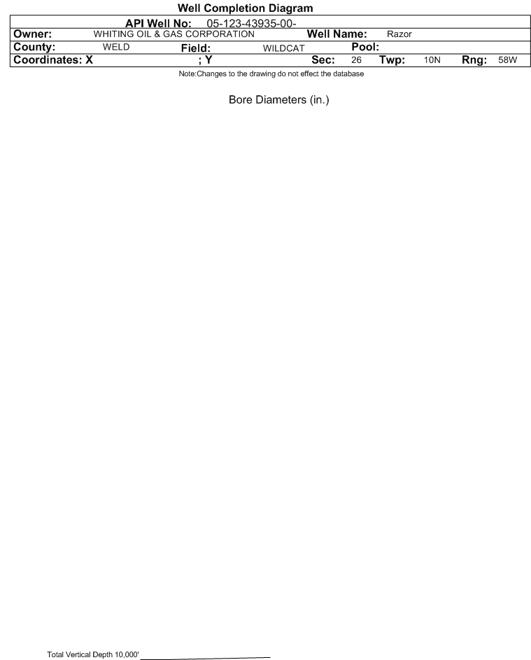 | Wellbore Completed | | Completion Date: | 5/26/2017 | | Spud Date: | 5/21/2017 | Spud Date Is: | ACTUAL | | Measured TD: | 13820 ft. | Measured PB depth: | 13777 ft. | | True Vertical TD: | 5735 ft. | True Vertical PB depth: | 5736 ft. | | Top PZ Location: | Sec:26 Twp: 10N 58W | Footage: 2451 FNL 1096 FEL | | Bottom Hole Location: | Sec:23 Twp: 10N 58W | Footage: 103 FNL 1002 FEL | | Log Types: | Mud log, MWD/LWD, CBL (Triple Combo in API 123-38488) | | Casing: | String Type: CONDUCTOR, Hole Size: 24 in., Size: 16 in., Top: 0 ft., Depth: 101 ft., Weight: 75 , Citings Type: ACTUAL | | Cement: | Sacks: 153, Top: 0 ft., Bottom: 101 ft., Determination Method: VISU | | Casing: | String Type: SURF, Hole Size: 13.5 in., Size: 9.625 in., Top: 0 ft., Depth: 2068 ft., Weight: 36 , Citings Type: ACTUAL | | Cement: | Sacks: 889, Top: 0 ft., Bottom: 2068 ft., Determination Method: VISU | | Casing: | String Type: 1ST, Hole Size: 8.5 in., Size: 5.5 in., Top: 0 ft., Depth: 13819 ft., Weight: 20 , Citings Type: ACTUAL | | Cement: | Sacks: 2355, Top: 1135 ft., Bottom: 13820 ft., Determination Method: CBL | | Formation | Interval Top | Log Bottom | Cored | DSTs | | PIERRE | 1411 ft. | | N | N | | HYGIENE | 3164 ft. | | N | N | | SHARON SPRINGS | 5545 ft. | | N | N | | NIOBRARA | 5550 ft. | | N | N |