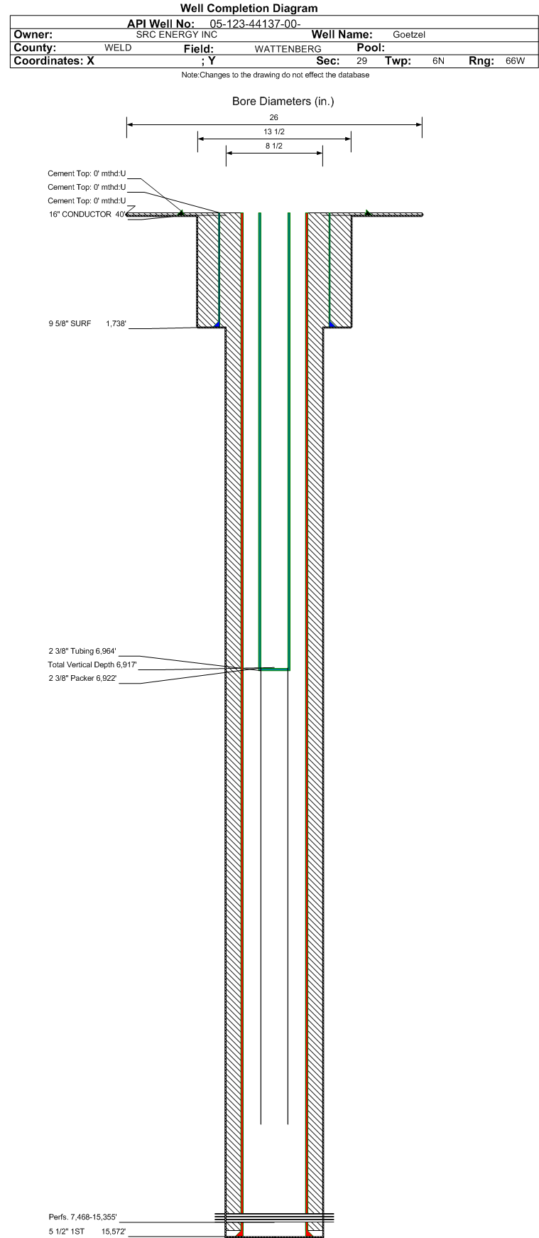 | Wellbore Completed | | Completion Date: | 4/26/2017 | | Spud Date: | 3/2/2017 | Spud Date Is: | ACTUAL | | Measured TD: | 15601 ft. | Measured PB depth: | 15489 ft. | | True Vertical TD: | 6917 ft. | True Vertical PB depth: | 6917 ft. | | Top PZ Location: | Sec:29 Twp: 6N 66W | Footage: 1159 FNL 2410 FWL | | Bottom Hole Location: | Sec:30 Twp: 6N 66W | Footage: 1182 FNL 151 FWL | | Log Types: | MWD/LWD, CBL, Mud, (Resistivity on 123-44136). | | Casing: | String Type: CONDUCTOR, Hole Size: 26 in., Size: 16 in., Top: 0 ft., Depth: 40 ft., Weight: 55 , Citings Type: ACTUAL | | Cement: | Sacks: 35, Top: 0 ft., Bottom: 40 ft., Determination Method: VISU | | Casing: | String Type: SURF, Hole Size: 13.5 in., Size: 9.625 in., Top: 0 ft., Depth: 1738 ft., Weight: 36 , Citings Type: ACTUAL | | Cement: | Sacks: 700, Top: 0 ft., Bottom: 1738 ft., Determination Method: VISU | | Casing: | String Type: 1ST, Hole Size: 8.5 in., Size: 5.5 in., Top: 0 ft., Depth: 15572 ft., Weight: 20 , Citings Type: ACTUAL | | Cement: | Sacks: 2064, Top: 0 ft., Bottom: 15481 ft., Determination Method: CBL | | Formation | Interval Top | Log Bottom | Cored | DSTs | | PARKMAN | 3506 ft. | | N | N | | SUSSEX | 4203 ft. | | N | N | | SHANNON | 4588 ft. | | N | N | | SHARON SPRINGS | 6747 ft. | | N | N | | NIOBRARA | 6781 ft. | | N | N |