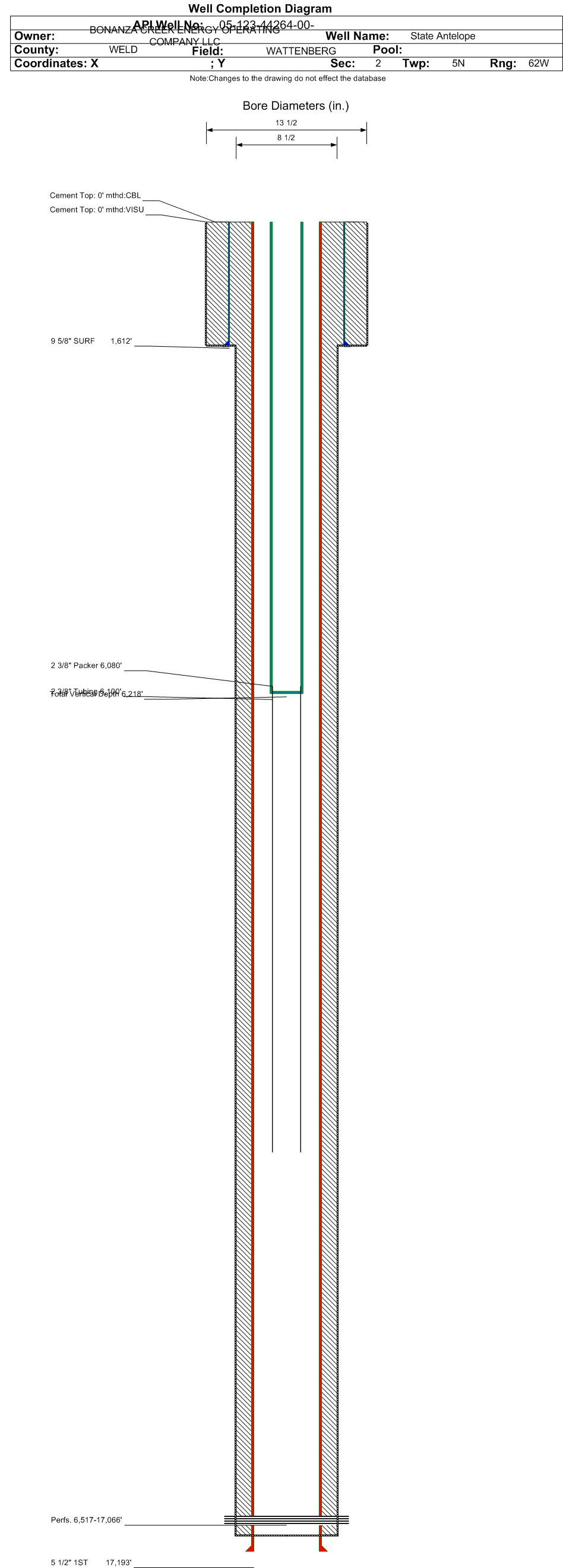| Wellbore Completed | | Completion Date: | 7/16/2018 | | Spud Date: | 6/25/2018 | Spud Date Is: | ACTUAL | | Measured TD: | 17203 ft. | Measured PB depth: | 17149 ft. | | True Vertical TD: | 6218 ft. | True Vertical PB depth: | 6218 ft. | | Top PZ Location: | Sec:2 Twp: 5N 62W | Footage: 368 FSL 3 FWL | | Bottom Hole Location: | Sec:14 Twp: 5N 62W | Footage: 430 FSL 15 FWL | | Log Types: | CBL, Mud, MWD/LWD, (Induction on 123-38879). | | Casing: | String Type: SURF, Hole Size: 13.5 in., Size: 9.625 in., Top: 0 ft., Depth: 1612 ft., Weight: 36 , Citings Type: ACTUAL | | Cement: | Sacks: 721, Top: 0 ft., Bottom: 1612 ft., Determination Method: VISU | | Casing: | String Type: 1ST, Hole Size: 8.5 in., Size: 5.5 in., Top: 0 ft., Depth: 17193 ft., Weight: 17 , Citings Type: ACTUAL | | Cement: | Sacks: 2731, Top: 0 ft., Bottom: 17193 ft., Determination Method: CBL | | Formation | Interval Top | Log Bottom | Cored | DSTs | | PARKMAN | 3385 ft. | | | | | SHARON SPRINGS | 6096 ft. | | | | | NIOBRARA | 6284 ft. | | | |